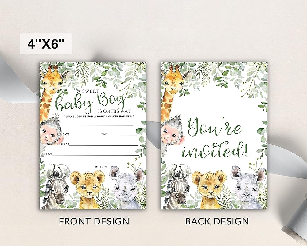 Baby Shower Invitations for boy safari, Jungle Animals Fill In Invites Cards wih Envelopes, Wooden Animas Baby Shower Activities Supplies, Set of 25.