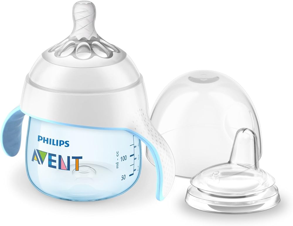 This Philips AVENT SCF251/01 My Natural Trainer cup makes it easier for your child to transition from bottles to sippy cups. Ideal for babies 4 months and up, this cup comes with both soft, Natural silicone nipple as well as a soft spout, allowing flexibility to move from bottle to cup whenever your child is ready to make the transition.The design encourages your child to gradually get used to drinking from a sippy cup while providing the familiarity of a bottle and the comfort of a soft spout. The petals inside the nipple increase softness and flexibility without nipple collapse, and it's innovative twin valve design reduces colic and discomfort by venting air into the bottle e and not baby's tummy. The trainer handles make it easy for little hands to hold the cup to encourage independent drinking. They are detachable, so you can simply add them when your baby is ready. The My Classic Trainer Cup is made from BPA free materials and includes a protective hygiene cap to keep the bottle and its contents clean. All pieces are dishwasher safe for easy cleaning. For versatility, this trainer cup is compatible with the Philips AVENT Natural bottle range, as well as the My Easy Sippy range and My Penguin Sippy Cup range.
