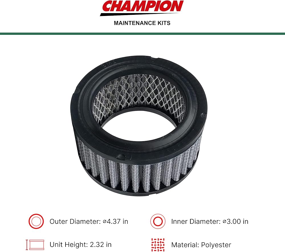 Includes 2 quarts of Champion air compressor oil synthetic lubricant and 1 pcs filter element