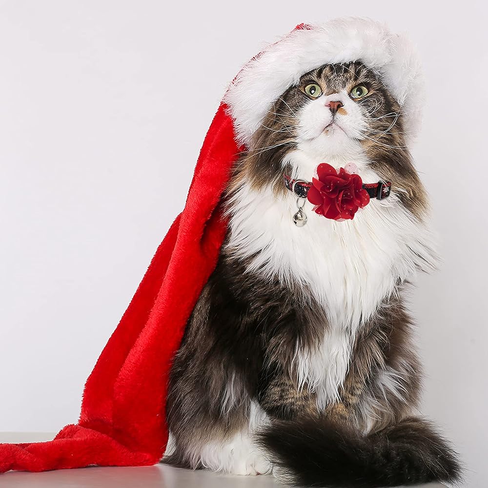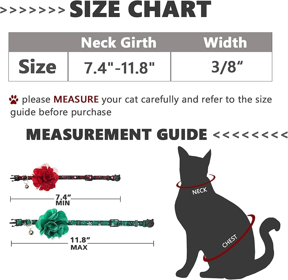The neck size of the Christmas cat collar set is 7.4"-11.8", suitable for small, medium and large cats, puppies, rabbits and other small animals. Please measure the size refer the size table and choose the appropriate size to buy.