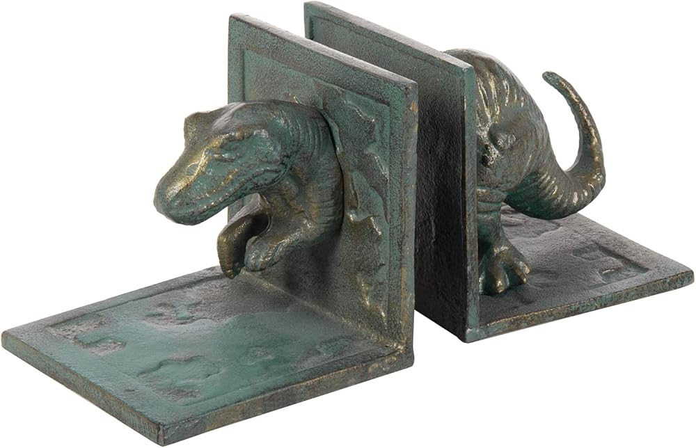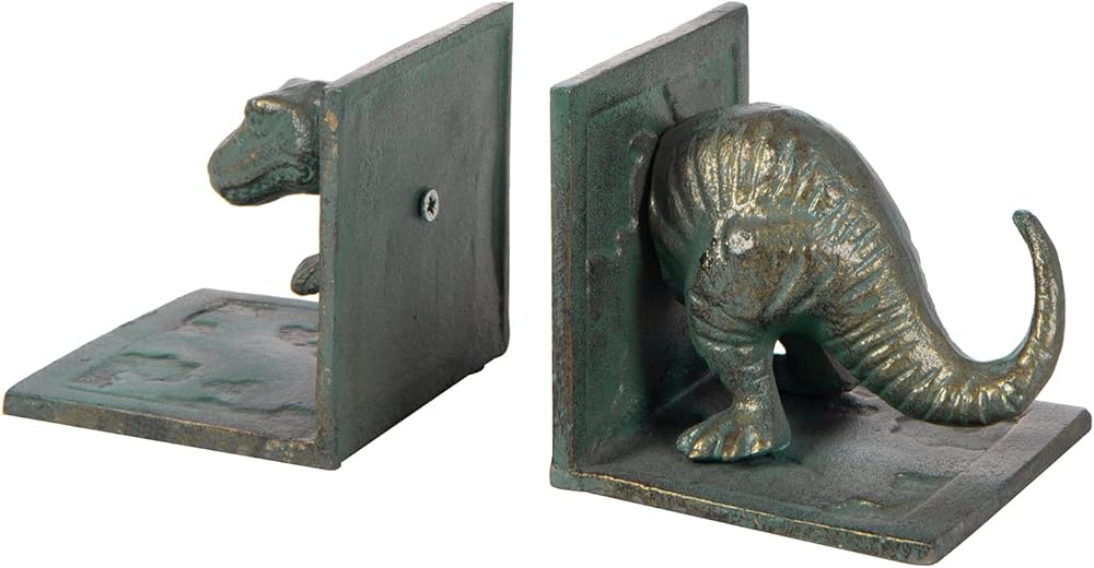 Give your books the display they deserve with these unique tyrannosaurus rex shaped decorative bookends. Easily displayed on any mantle, shelf, table, or desk, these book holders feature a vintage oxidized finish, adding a rustic touch to your home or office décor. Durable cast iron construct and non-slip foam feet, help keep heavy books upright and book stoppers from sliding on surfaces. The unique dinosaur shape is fun for any boy's room, play area, or even just dinosaur-enthusiast's living room. No matter where you feature this rustic T-rex bookend set, it will have a roaring good time.