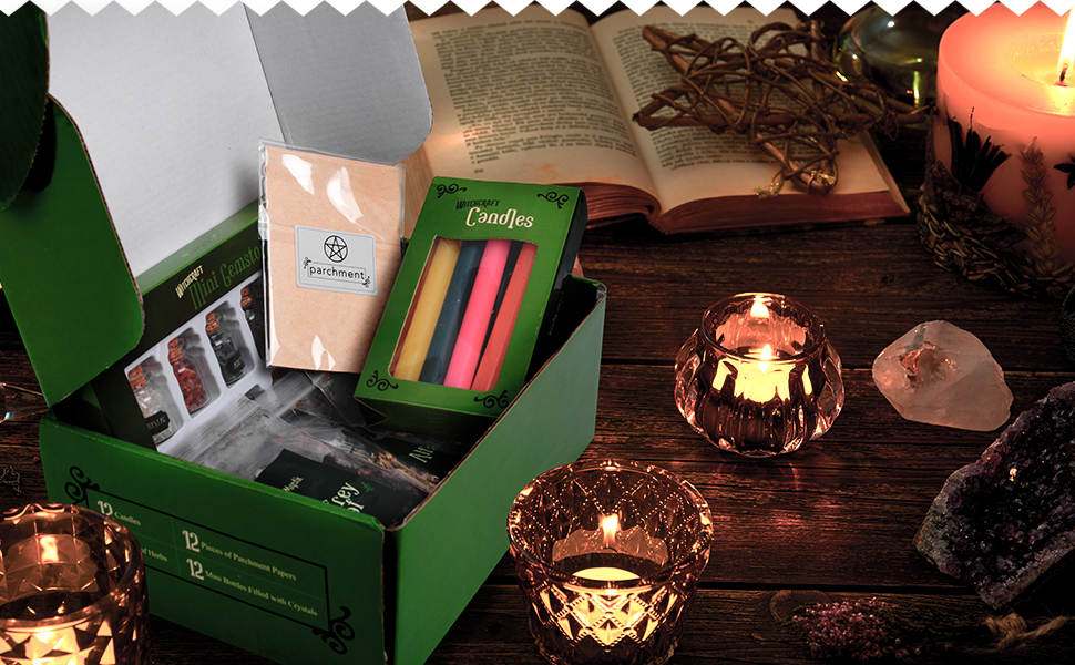 All-in-one Kit: Unbox this combo set loaded with witchcraft supplies and spiritual decor items to make a little magic happen! Inside you will discover 12 individually and thoroughly sealed dried herbs packages, 12 mini gemstones sealed bottles, and 12 colored candles; All the Wiccan altar supplies, hippie room decor items you need to manifest your wishes and hippie, gothic, ,moon room decor, except the hassle!