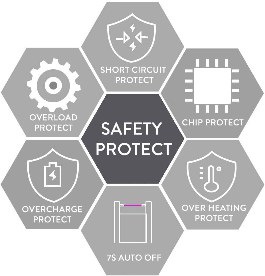 【SAFETY DESIGN】- A safety lock switch is designed to preventing mistakenly touching. Over charging and over loading design protection, 7S auto shut off ensures to prevent high temperature damage.