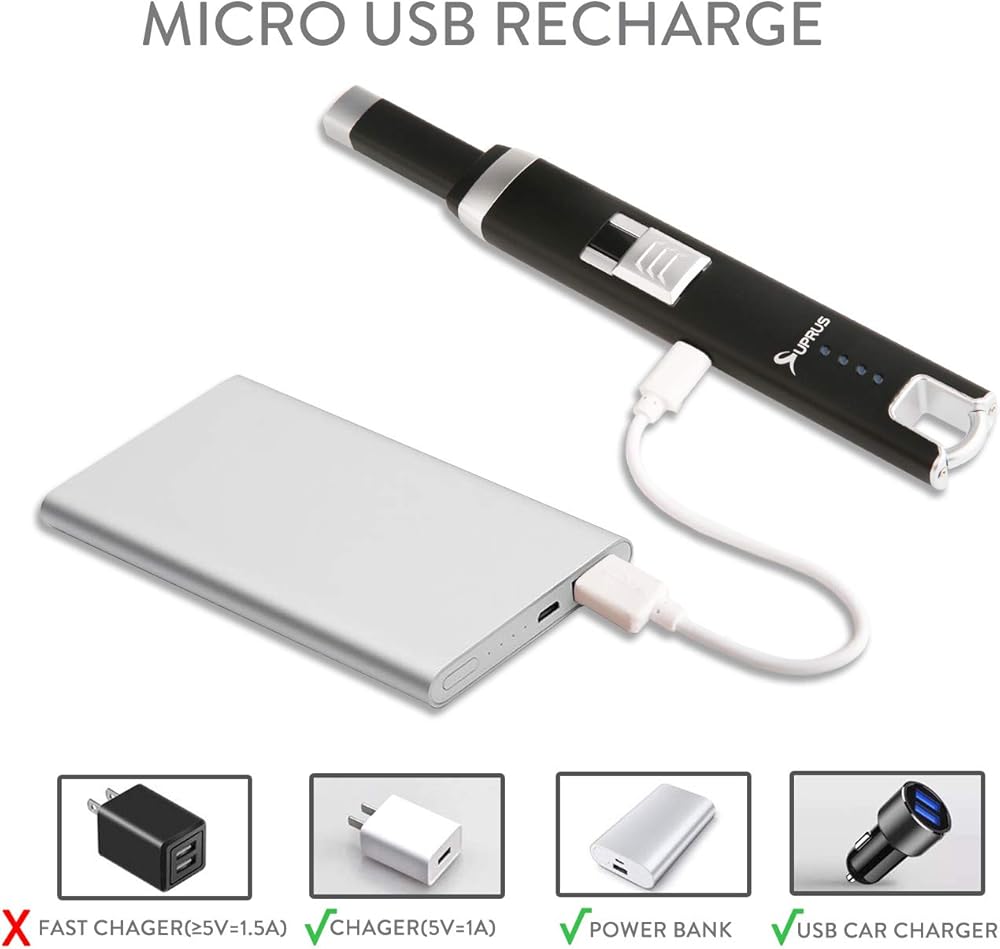 【BATTERY NOTIFICATION】- This is the upgraded SUPRUS arc lighter which can display real time battery volume. When 4 LED lights on the barrel turn on, it is full charged.If you don't use the product very often, please recharge the Battery about 1 hours continuously for every 3 months to protect the life of the Battery.