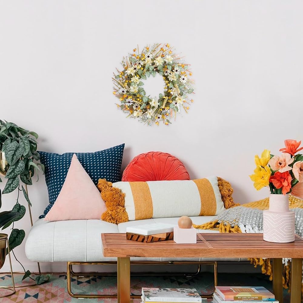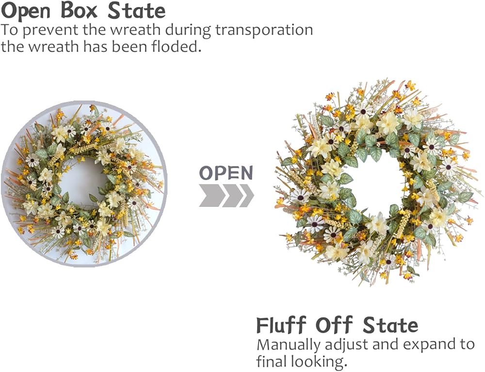 idyllic 22 Inches Spring Wreath for Front Door with Yellow and White Daisies Flowers, Ear of Wheat, Green Leaves, Fall Harvest Wreath for Festival Thanksgiving Farmhouse Wall Home Decor