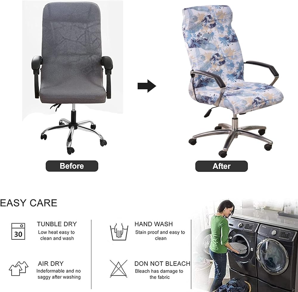 EASY TO CARE. Our office chair covers are machine washable that only requires very little maintenance. Wash in cold water and gentle cycle separately, tumble dry low, do not bleach or iron. Using mild laundry detergent.