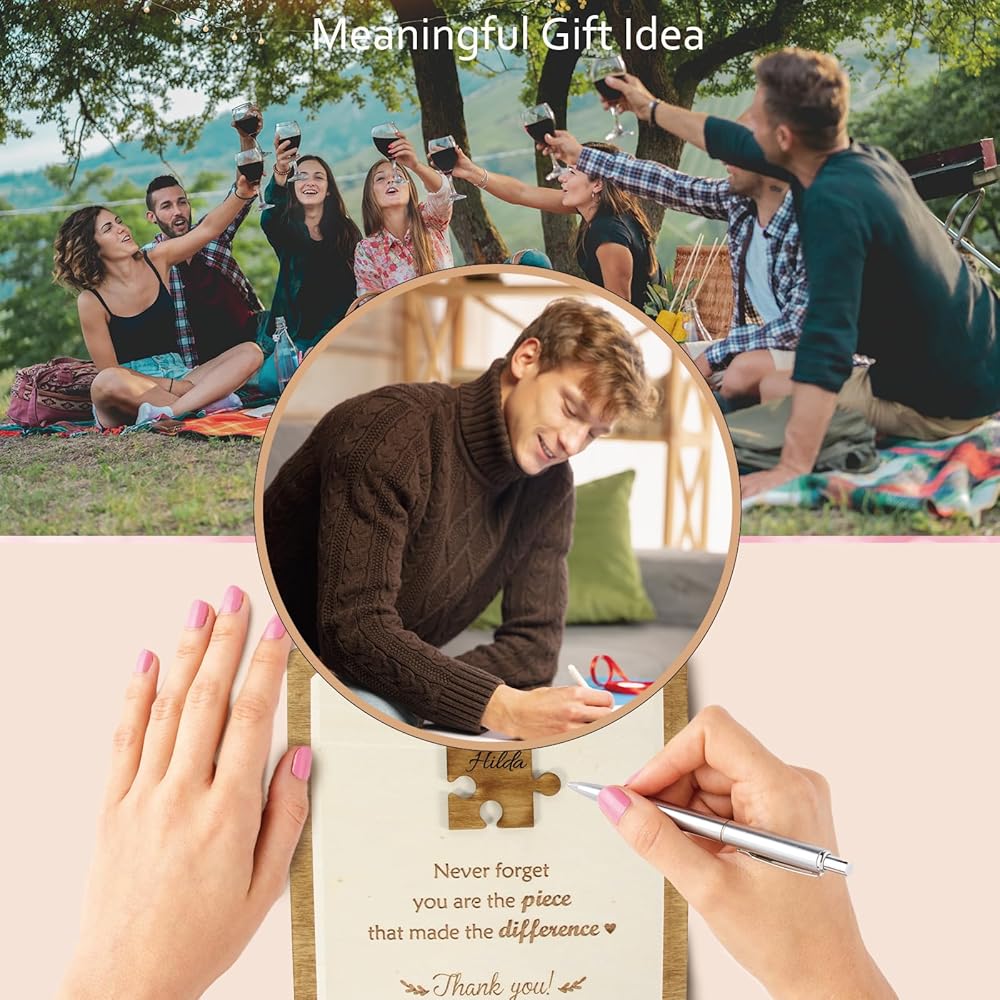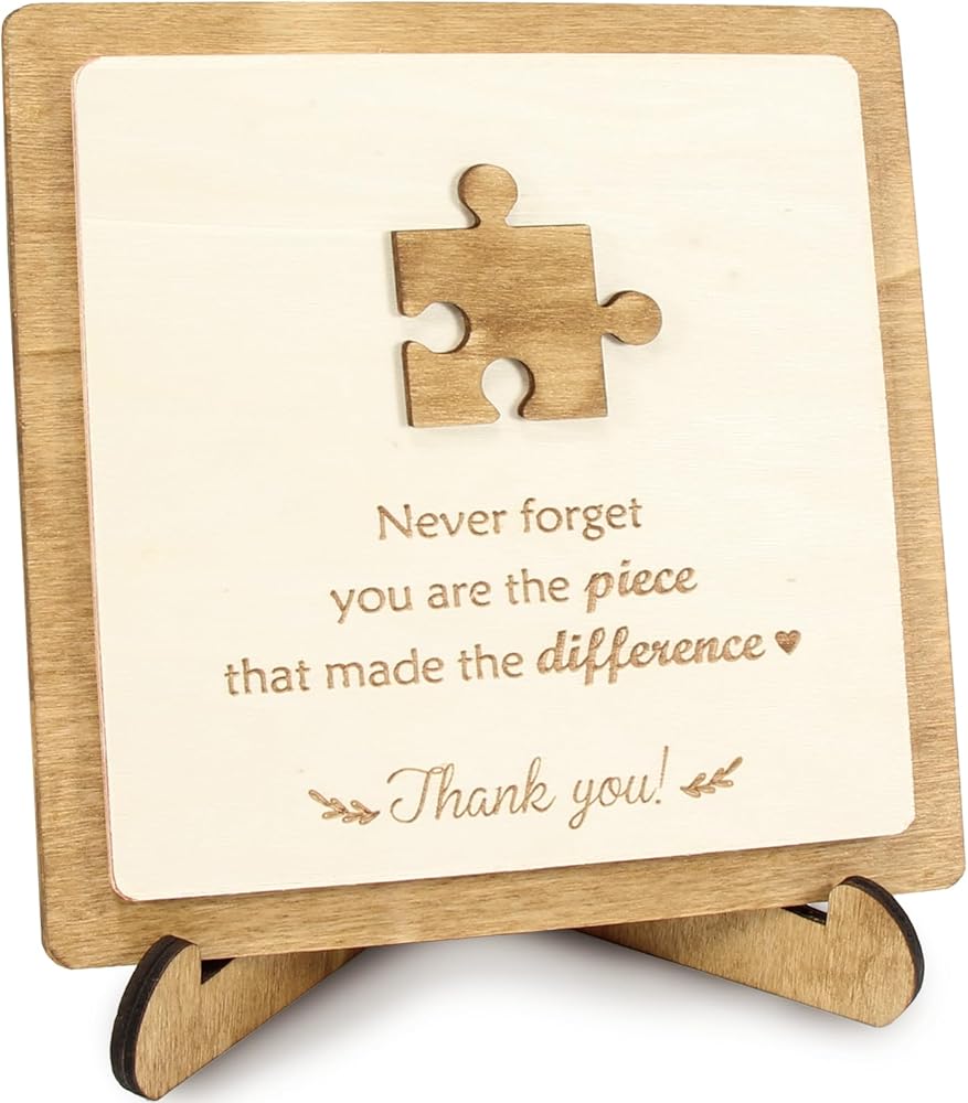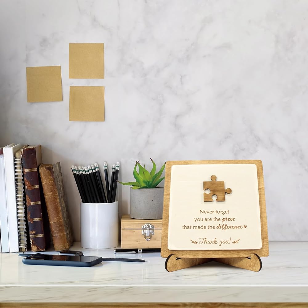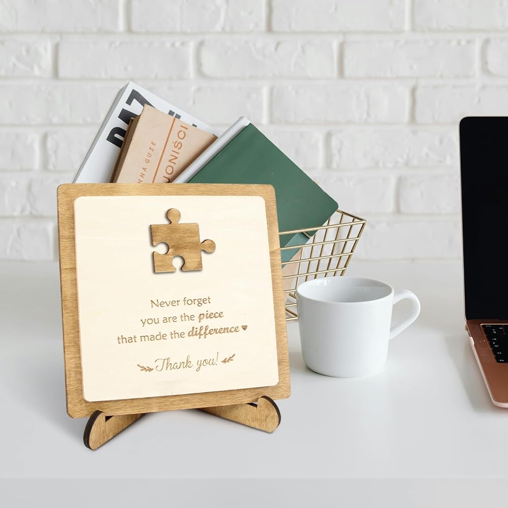 Looking for a meaningful gift to express gratitude and provide inspiration in the office? This wooden plaque is the perfect choice for coworkers, bosses, mentors, teachers, and more. Crafted with sturdy and rustic wooden materials, the square multi-layered plaque features a laser-engraved message: "Never forget you are the piece that made the difference." The wooden plaque comes with a wooden stand, allowing it to be displayed on desks, office shelves, or home mantels. It serves as a constant reminder of the recipient's significant impact and role. The plaque also includes a wooden puzzle piece, adding a symbolic touch and personalizing the gift for the recipient. This versatile gift is suitable for various occasions. It is a thoughtful way to express gratitude and give encouragement to coworkers, bosses, and best friends. On the back of the plaque, there is ample space to personalize the gift further by writing heartfelt messages, expressions of thanks, or best wishes. This makes the gift truly unique and treasured by the recipient. Give the gift of appreciation and inspiration with this heartfelt wooden plaque. Whether it's for a coworker, boss, mentor, or teacher, this unique and thoughtful gift will remind them of their meaningful contribution and inspire them to continue making a difference. Perfect for office decor, this plaque will be a constant source of motivation and encouragement for all who receive it.