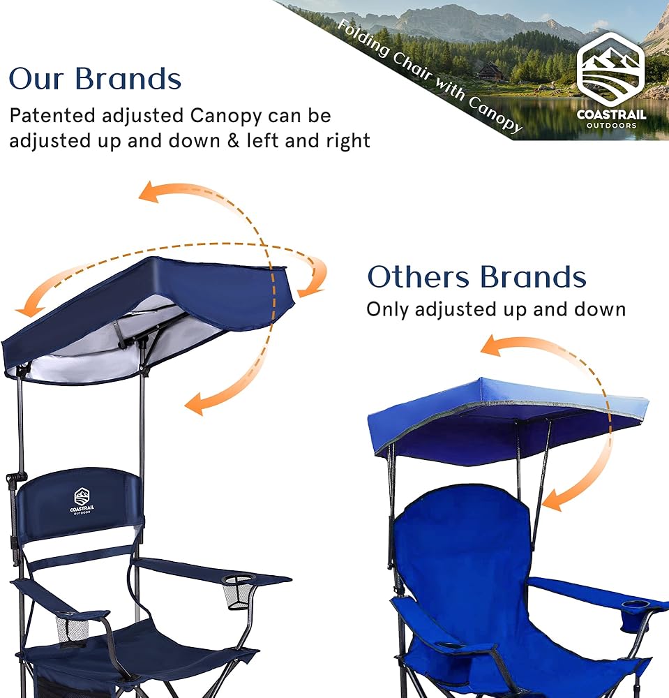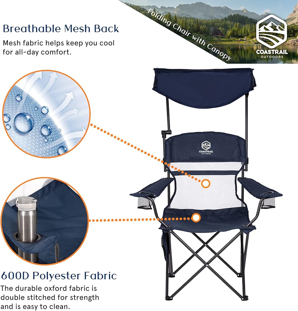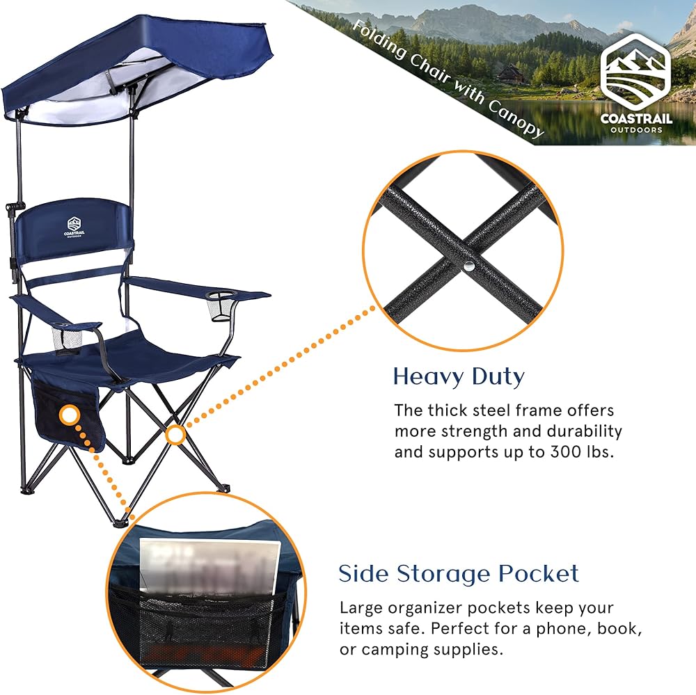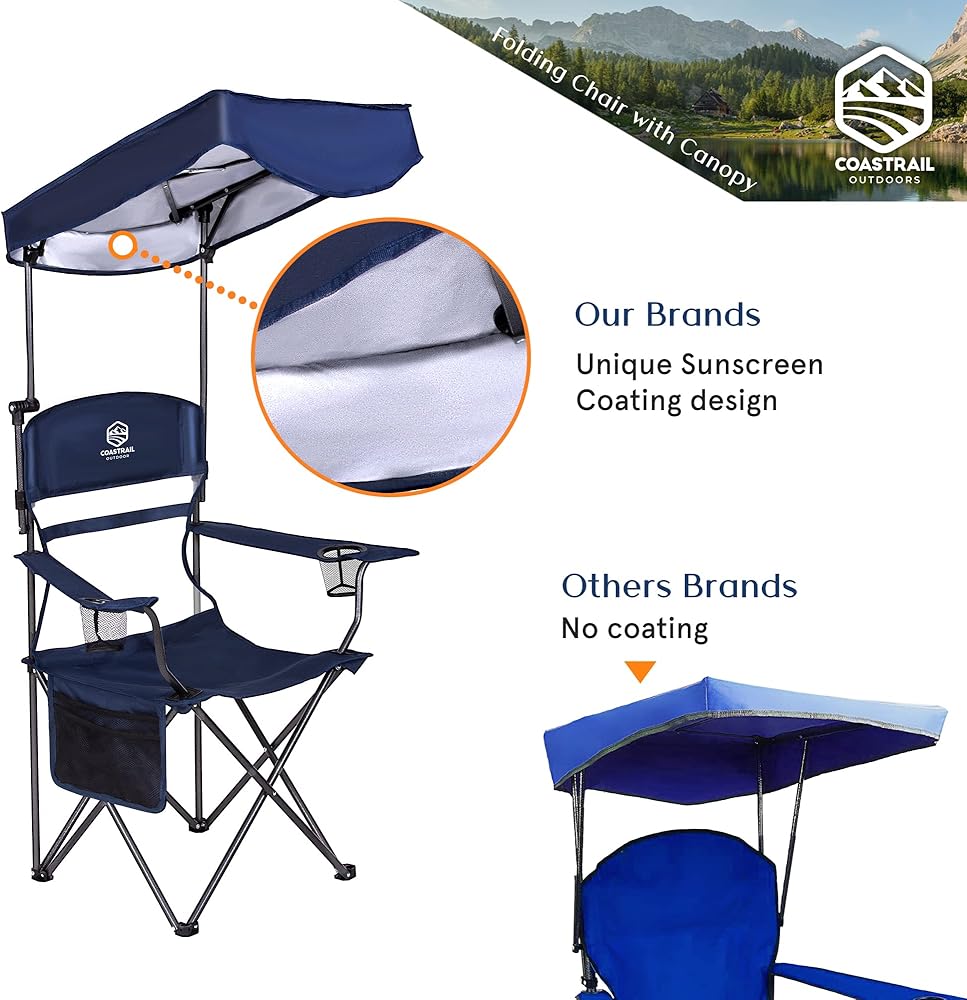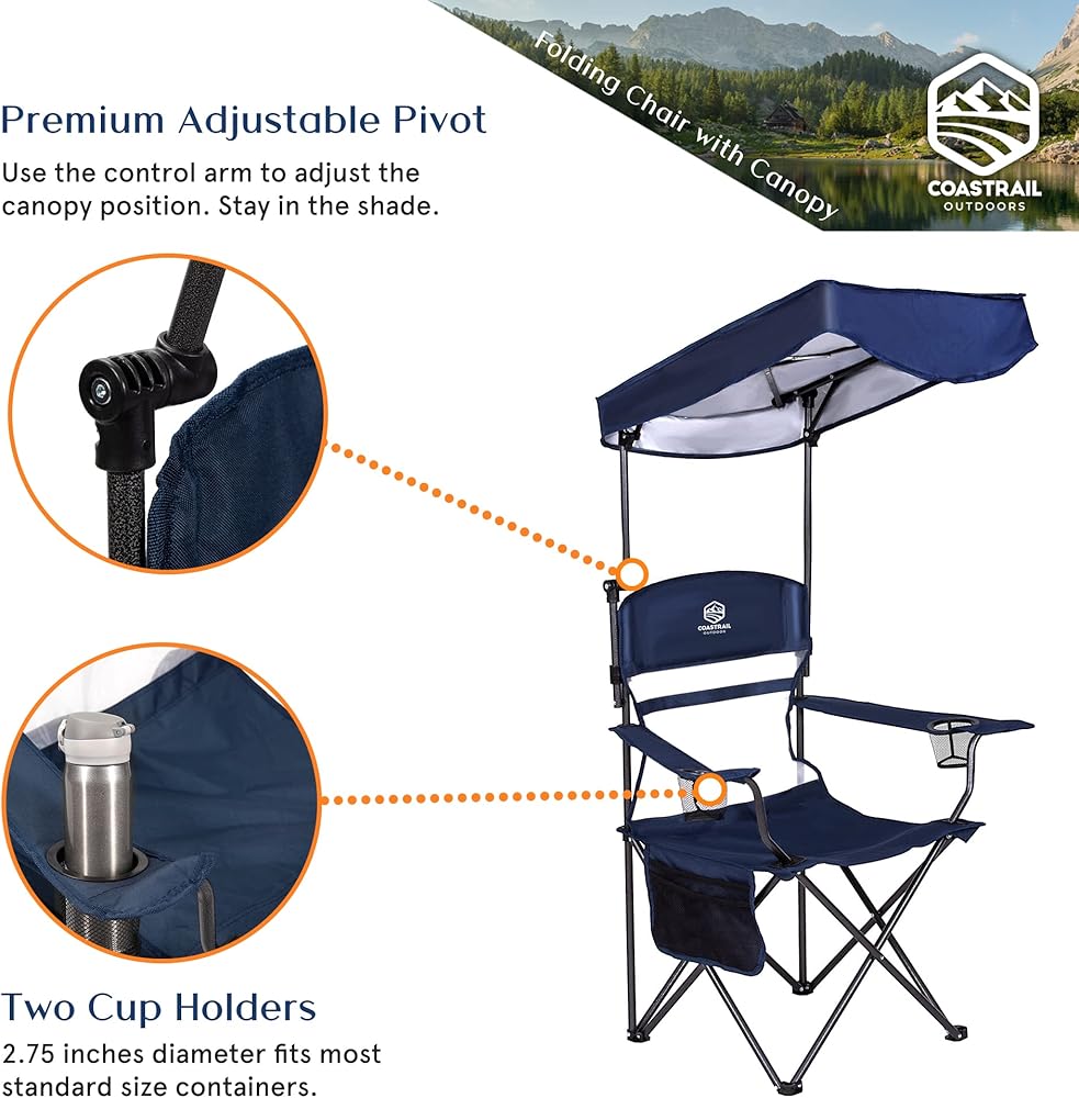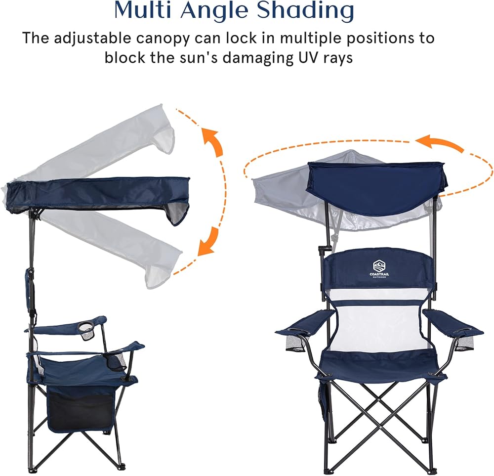 Coastrail Outdoor Shade Folding Camp Chair allows you to have fun in the sun. The adjustable canopy can be locked in multiple positions to block the sun's damaging UV rays. Take this comfortable and portable chair anywhere and protect yourself from the sun. Relax with your drinks and extra storage bags to keep your belongings safe.