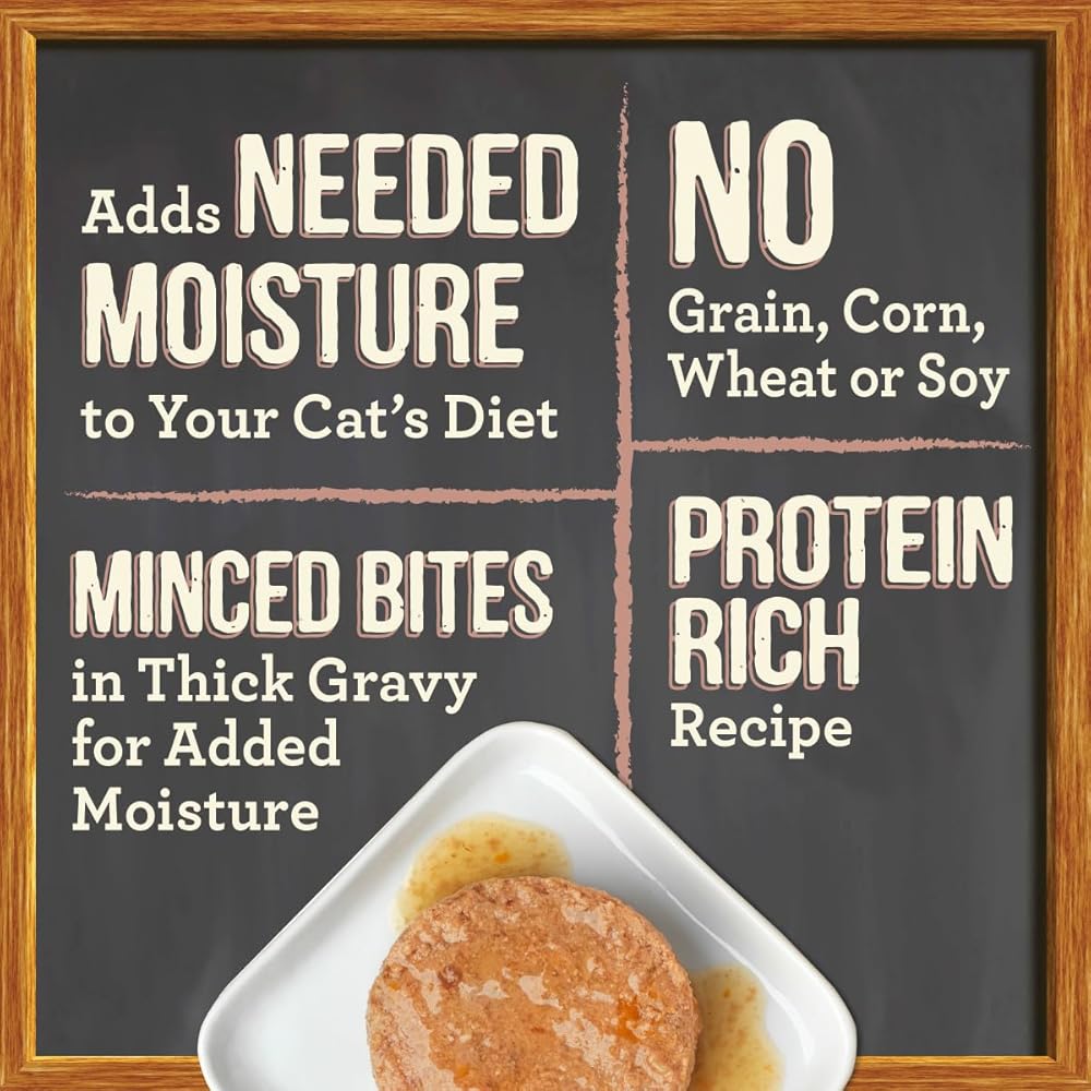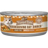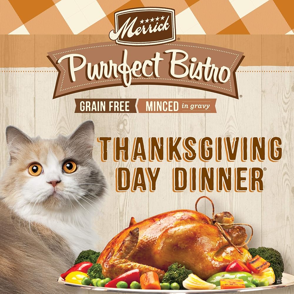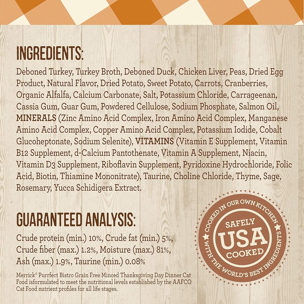 Merrick Purrfect Bistro Thanksgiving Day Dinner Minced in Gravy Grain Free Wet Cat Food is crafted for cats who appreciate the finer things. Cats thrive on a grain free diet that is high in quality protein. Real deboned turkey is always the first ingredient in this Purrfect Bistro cat food gravy and minced recipe. Made with a delectable gravy that adds needed moisture to your cat's diet, this natural, grain free minced cat food is fortified with the vitamins, minerals, probiotics and antioxidants that are ideal for adult cats. With a focus on nutrient-rich ingredients to support overall health, Merrick wet cat food in gravy recipes never use artificial colors, flavors or preservatives. This adult cat food is crafted without grain, wheat, corn or soy for a truly delicious and filling meal. Whether your cat prefers our gourmet minced in gravy entrees or a soft pate turkey cat food, Purrfect Bistro recipes are ideal for both indoor and outdoor cats and come in a variety of flavors your cat will love. All Merrick recipes are crafted in our Hereford, TX kitchen and cooked in the USA, in facilities that uphold strict FDA guidelines.