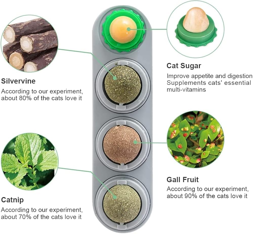 4 Flavors, 4 Different Attractions: 4 flavors include: catnip, silvervine, gall fruit and cat sugar. Catnip, silvervine and gall fruit are all natural herbs. When cats lick or rub these magic balls, they might get very excited and roll around. Cat sugar is used to supplement your cat's daily vitamin needs. 4 Flavors, there is always one of which your cats will love.