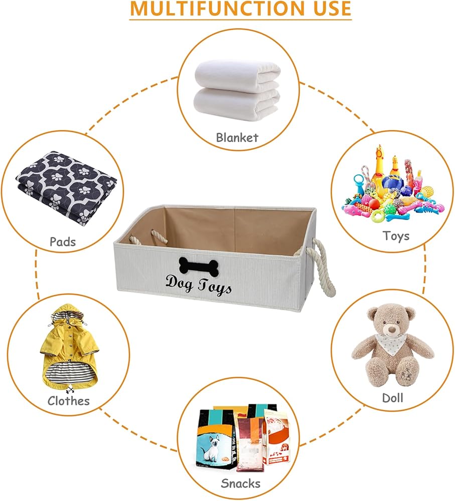1: Large Dog Toy Bin - Made of canvas linen+PP board.The silhouette is sturdy and stackable.Durable fabric with double-stitched carrying handles on two side, this dog toy basket is great for dog toy/leash/blanket/clothes or dog treat basket.
