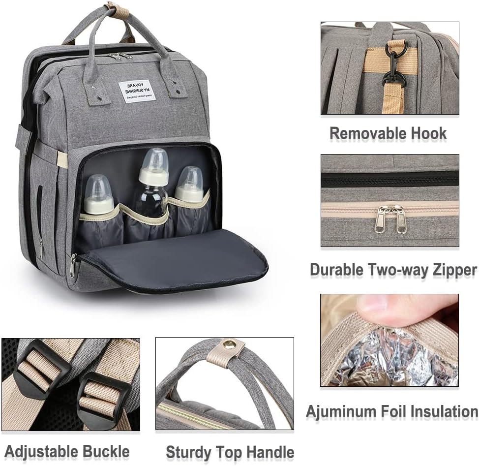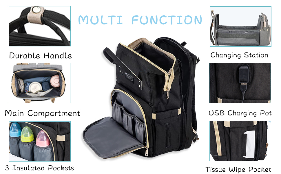 【Exceptional Design】:This baby diaper bag has a built with USB Charging Port and Power Cable to help to recharge your cell phone on the go conveniently.The waterproof outer coating and 3 aluminum foil insulation bags on the front can keep the baby bottle warm.