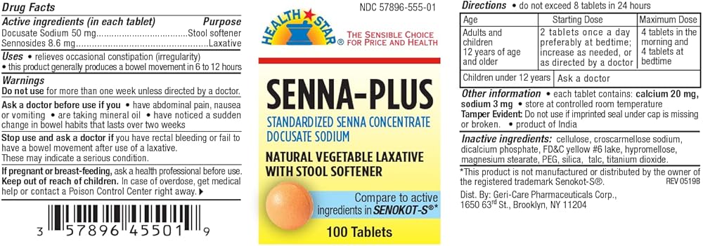 GeriCare Senna Plus Natural Laxative with Stool Softener, Docusate Sodium 50mg, Sennosides 8.6mg, (200 Tablets)