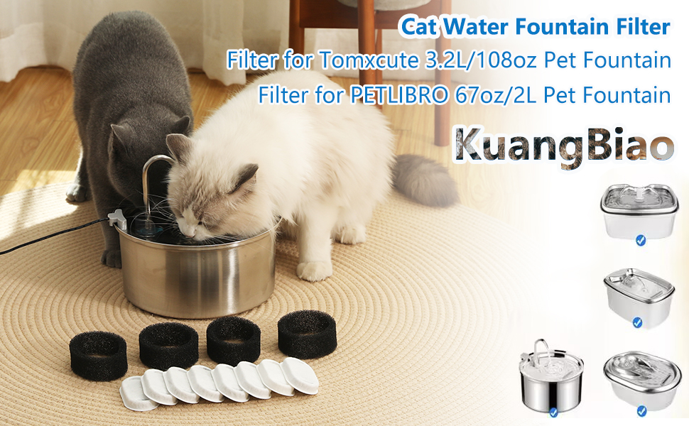 【Perfect Match】These are KuangBiao branded cat water fountain filters, compatible With Tomxcute 108oz/3.2l fountain, compatible with Petlibro 67oz/2l stainless steel fountain , compatible with SOOFPET 3.2L/108oz fountain ,compatible with OlarHike 61oz/1.8L fountain,compatible with DOOOB 3.2L/108oz fountain ,Filters are not created or sold by above brands