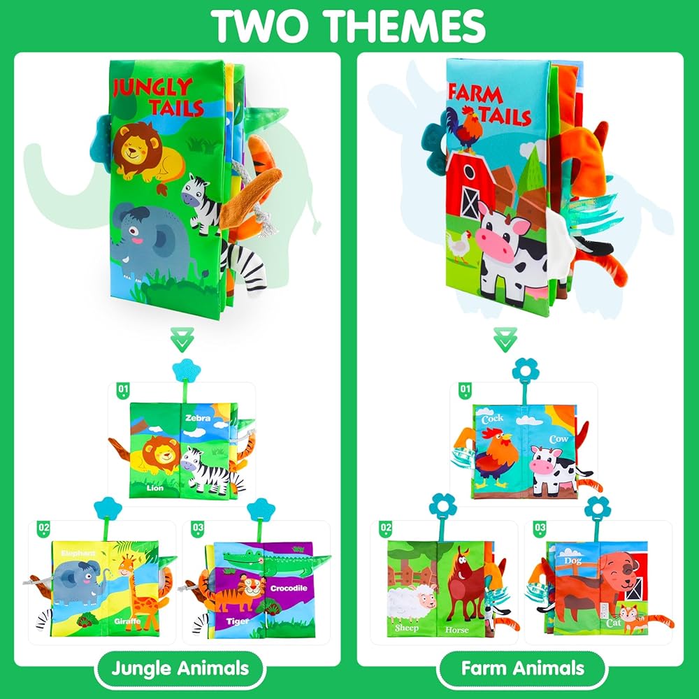 Baby Soft Cloth Crinkle Books Early Education Interactive Stroller Car Seat Sensory Toys with Tails Newborn Development Gifts for 0-6 Months Infants Toddler Baby Boys Girls(Jungle & Farm)