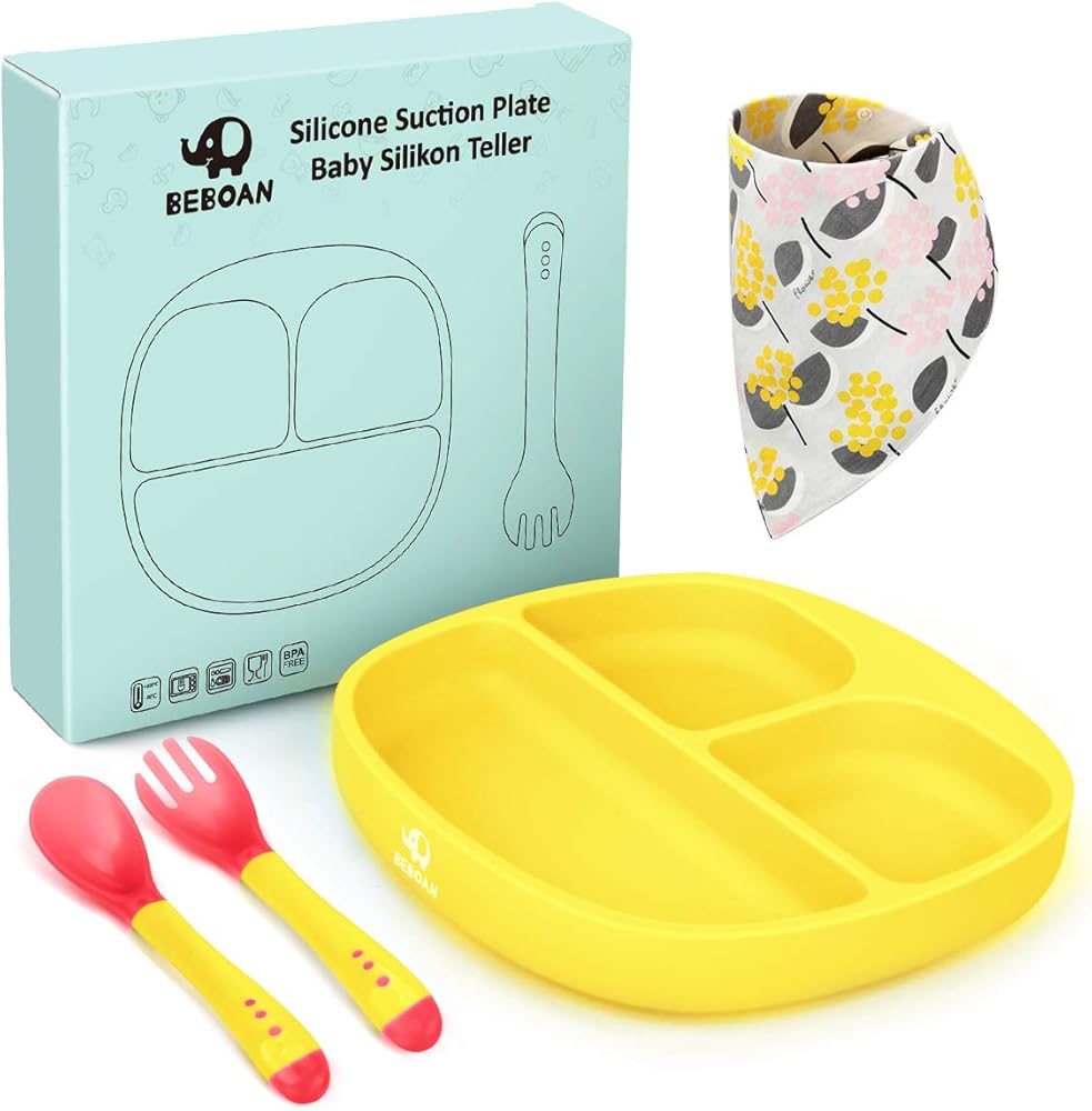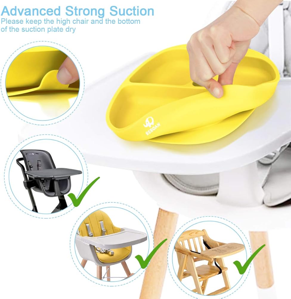 BEBOAN Baby Suction Plate, Silicone Divided Plate Set with Lid, Fork and Spoon for Boys and Girls, 100% BPA-Free Baby Food Plate, Dishwasher & Microwave Friendly, Fits for Most High Chair (Yellow)