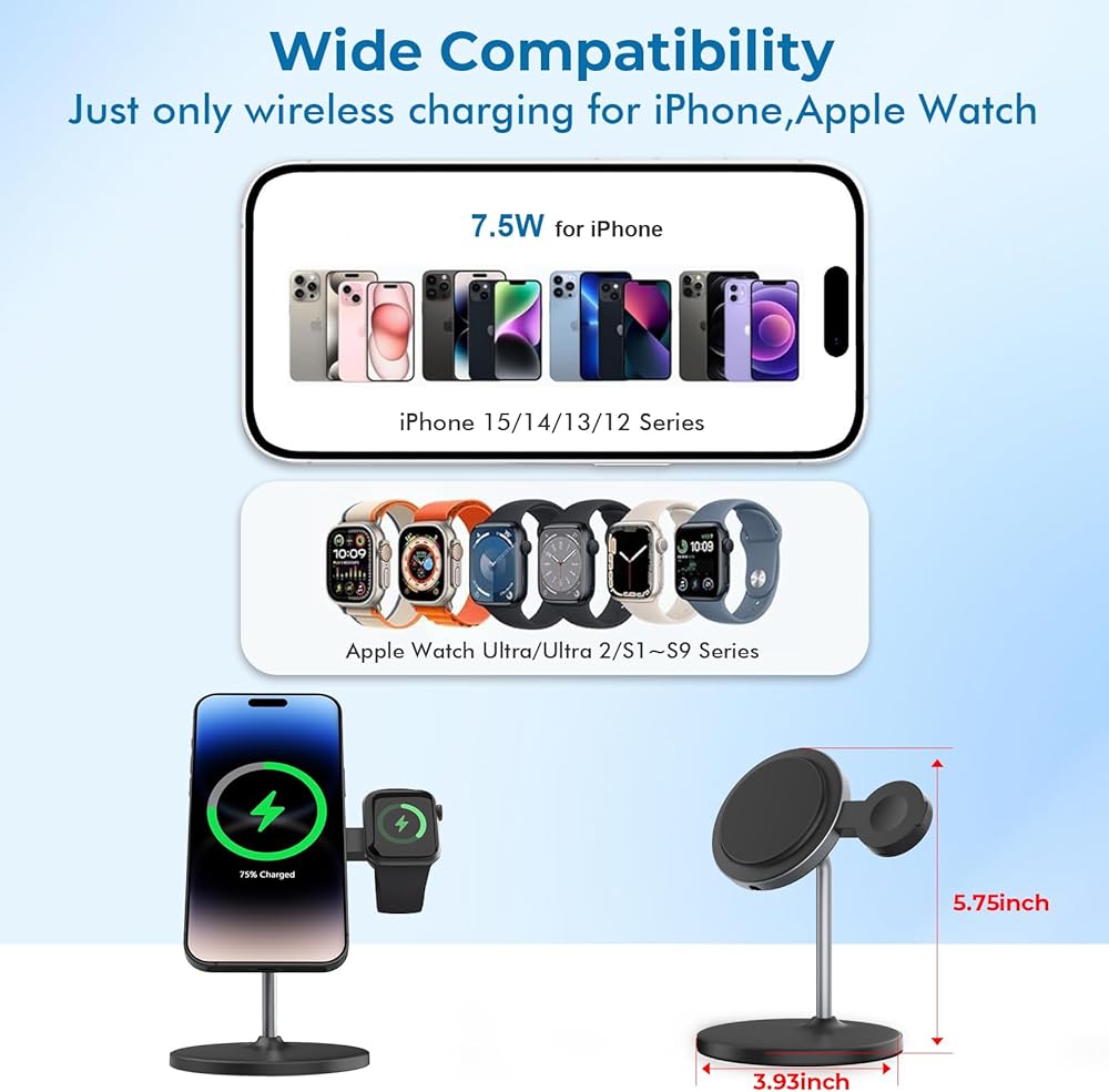 【Wide Compatibility】This wireless charger is compatible with iPhone 15/14/13/12/Pro Max/Plus/Pro/mini), charger for Apple Watch Ultra/Ultra 2/S9/S8/S7/S6/SE/S5/S4/S3/S2/S1. One charger effortlessly meets the charging needs of two devices, making it an ideal wireless charger for iPhone and Watch.