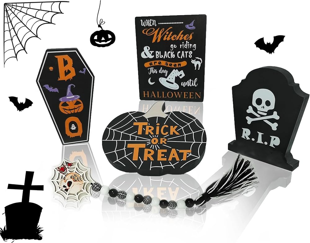 Exquisite Design:It's a set that fits the Halloween decor with a gothic twist! 1 P Coffin lid design with BOO.1 P spider pumpkin with Trick or Treat sign .1 P Wood Black RIP with Skull Halloween Decorative Tombstone.1 P When Witches Go Riding Black Cats are Seen The Moon Laughs and Whispers tis Near Halloween sign. 1 P of bead garland with tassel and spider Skull Hang Tag.They can add character to home throwing an amazing Hocus Pocus Halloween Party!