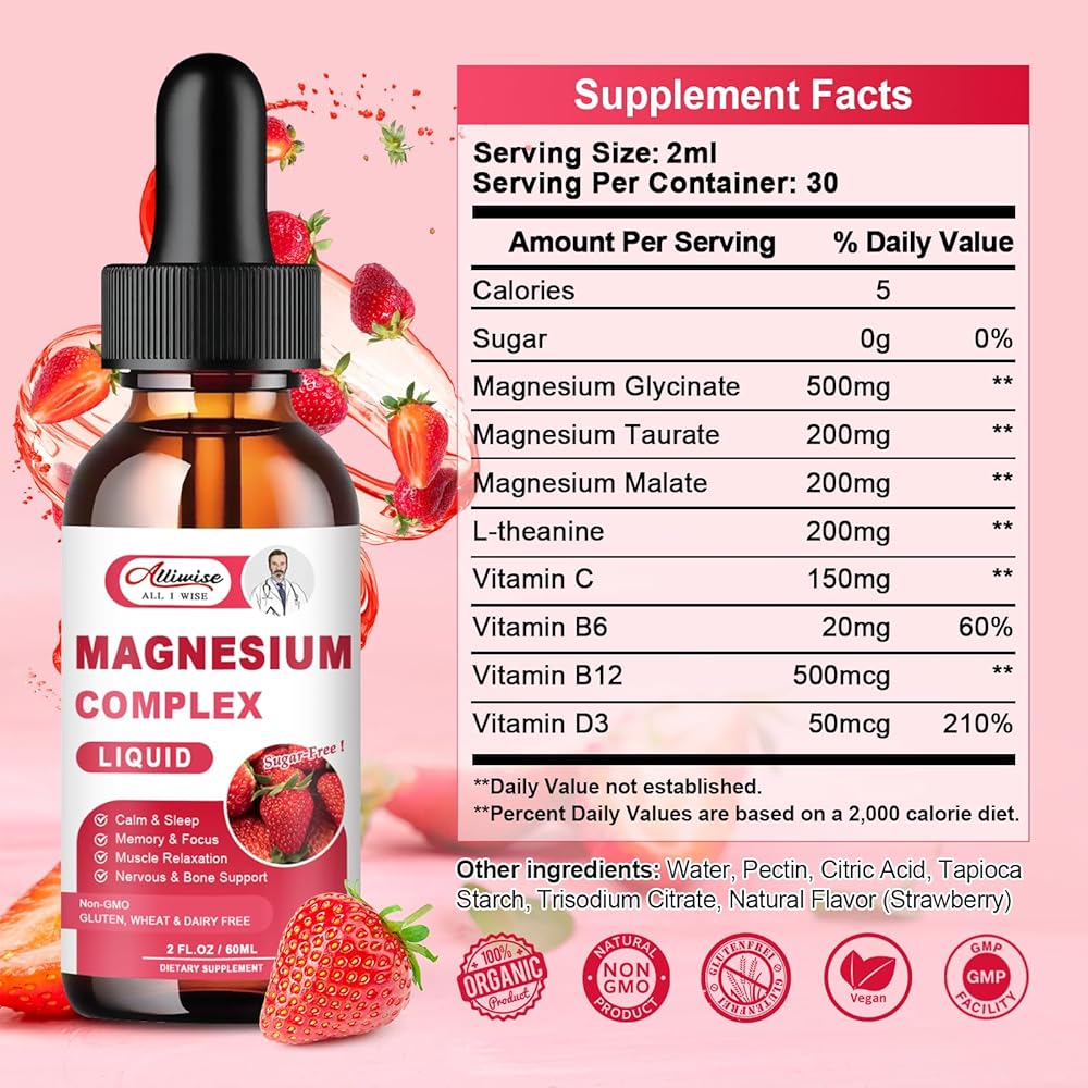 HIGH BIOAVAILABILITY - One drop of liquid gets the highest absorption! The perfect combination of magnesium glycinate 500MG, magnesium Taurate 200MG, magnesium malate200MG, and 500mcg vitamin B12 and 20mg vitamin B6 can easily maximize the body's absorption of element magnesium.In addition, the absorption rate of liquid supplements is up to 95% higher than that of pills and capsules, and they are easy to use. They can be taken directly or added to water or your favorite beverage.