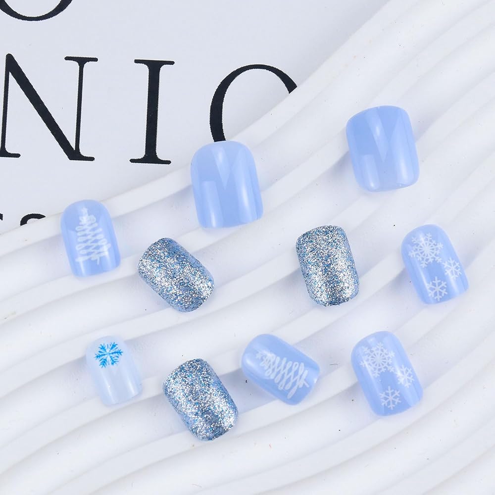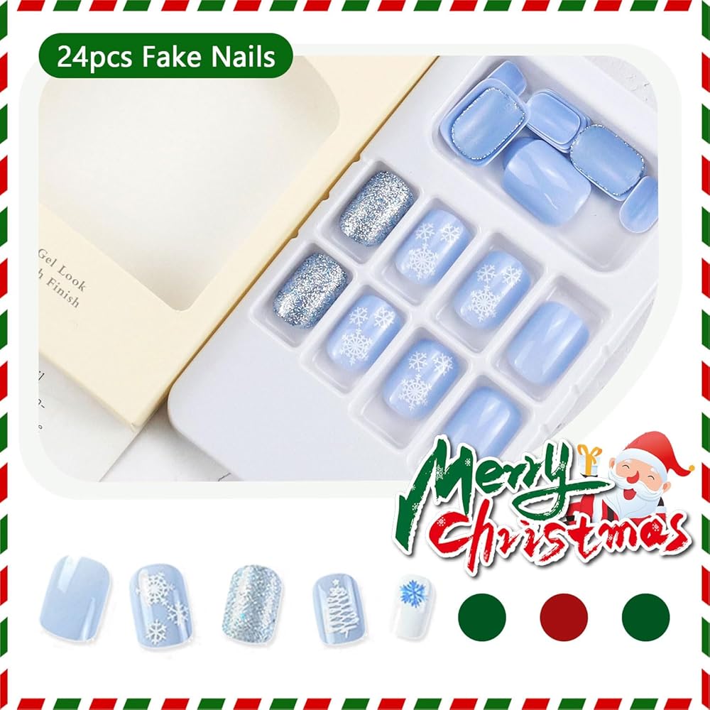 Snowflake Press On Nails Short Square, 24pcs Glossy Medium Square Fake Nails, Snowflake Treen Design, Winter False Nails For Women Girls X-mas Nail Decoration (Blue Snowflake Square)