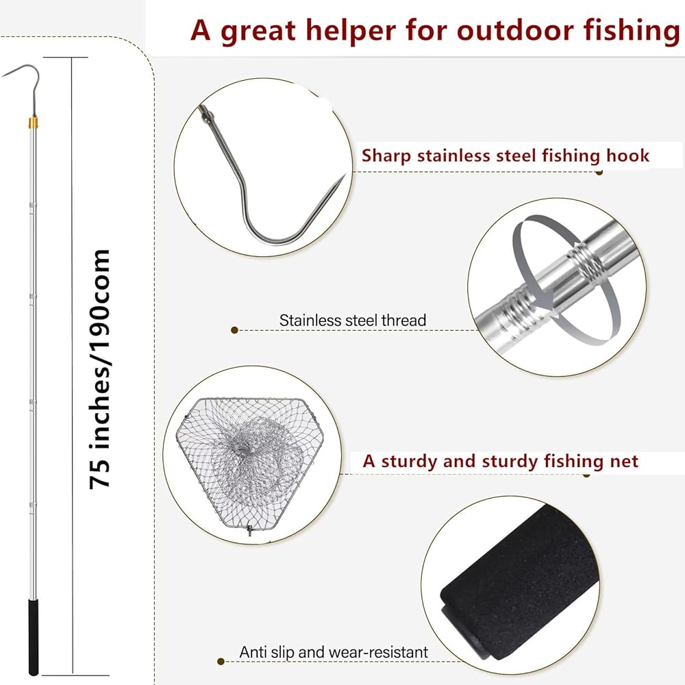 fishing gaff saIntroducing the Cagaloi 71-Inch Extended Telescopic Hook Rod Fishing Gaff Fish Gaff, the ultimate tool for all your fishing adventures. Whether you're into flounder gigging, fish spearing, or fishing with a net, this versatile fishing accessory has got you covered. Featuring an extendable design, this fishing gaff can reach up to 71 inches, allowing you to easily hook larger fish without straining yourself. The telescopic hook rod ensures that you have the reach you need to bring in your catch. Crafted from high-quality materials, this fish gaff is built to withstand the toughest fishing conditions. The sturdy hook and strong rod provide the durability and reliability you need for successful fishing trips time and time again. Not only is the Cagaloi Fishing Gaff functional, but it is also incredibly user-friendly. The comfortable handle grip makes it easy to hold and maneuver, even with wet hands. You can focus on reeling in the big ones without worrying about losing your grip.ltwater1221