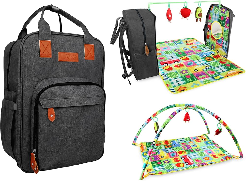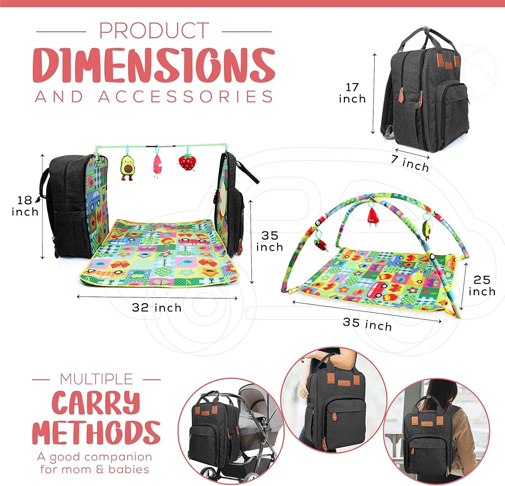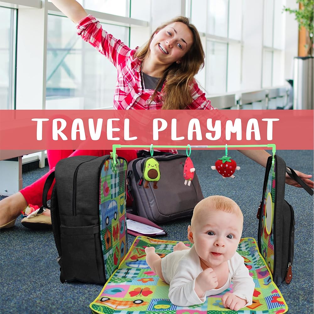 3 in 1 Diaper Bag Backpack with Baby Play Mat Multifunctional Activity Mat with Diaper Caddy Organizer Baby Play Gym Includes 3 Toys Separate or Together for Travel