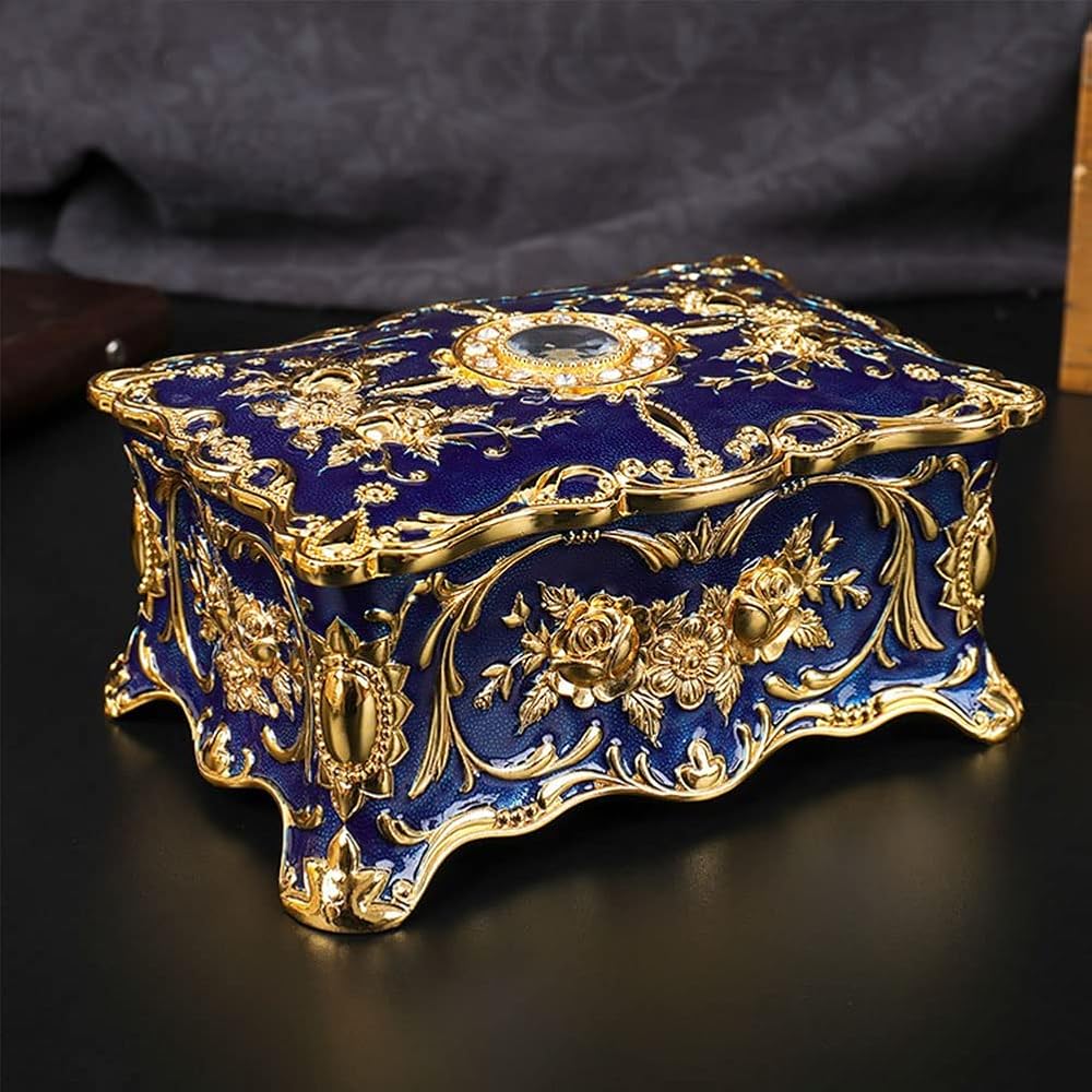 Luxury Vintage Rectangle Metal Alloy Jewelry Box Trinket Organizer Storage Box with Rose Pattern for Women, Girls, Two-Layer Design, Gold & Blue, Large
