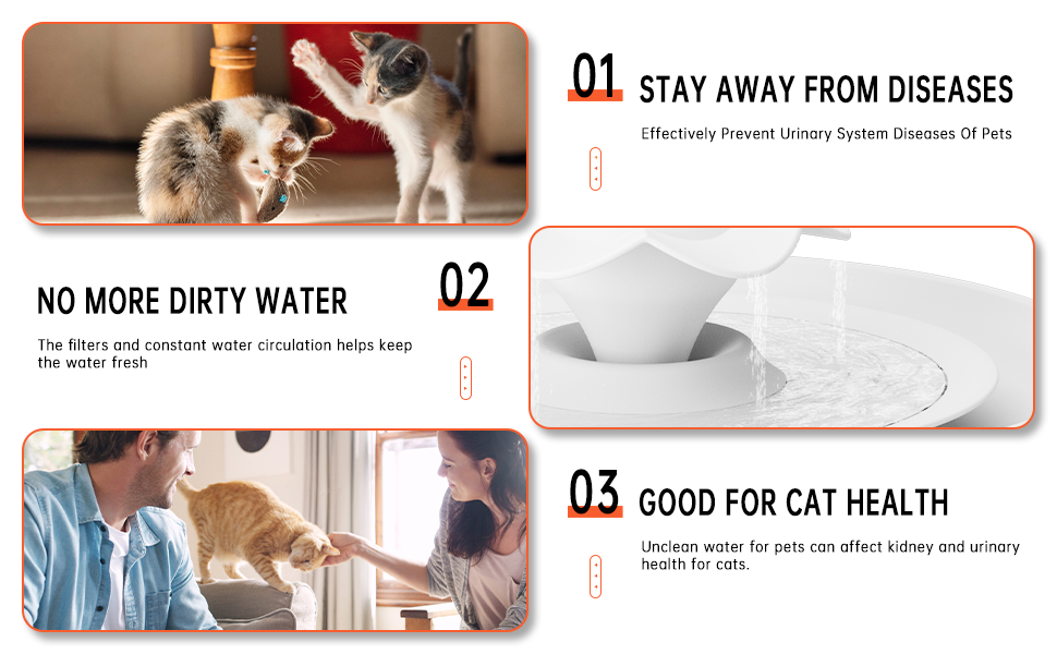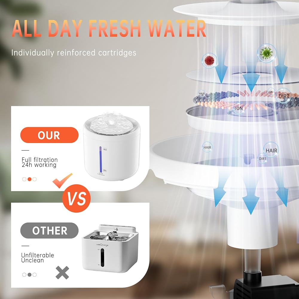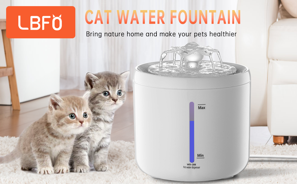 24-Hour RECICULATION FILTRATION: LBFO cat water dispenser's filtration system consists of non-woven fabric, activated carbon and ion exchange resin to effectively filter impurities, pet hair and debris. The ion exchange resin layer softens the water and removes calcium and magnesium ions. The activated carbon removes nasty tastes and odors.LBFO cat water fountain is always ready to provide clean and healthy water for your furry friend.