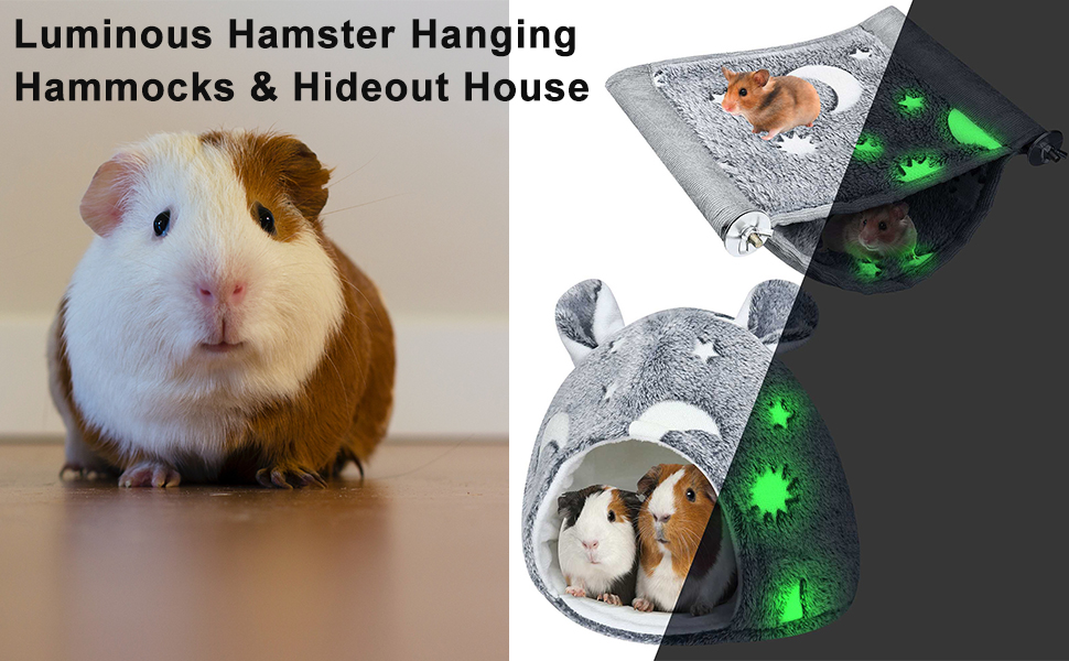 【Glow-in-the-dark Hamster Hammock】-- Our guinea pig toy bed uses a magical pattern-lighting design, exposing it to bright light for more than 30 minutes and then placing it in the dark, the stars and moon pattern will emit a soft bright starry warm light, which will give your pet a new entertainment experience like never before.