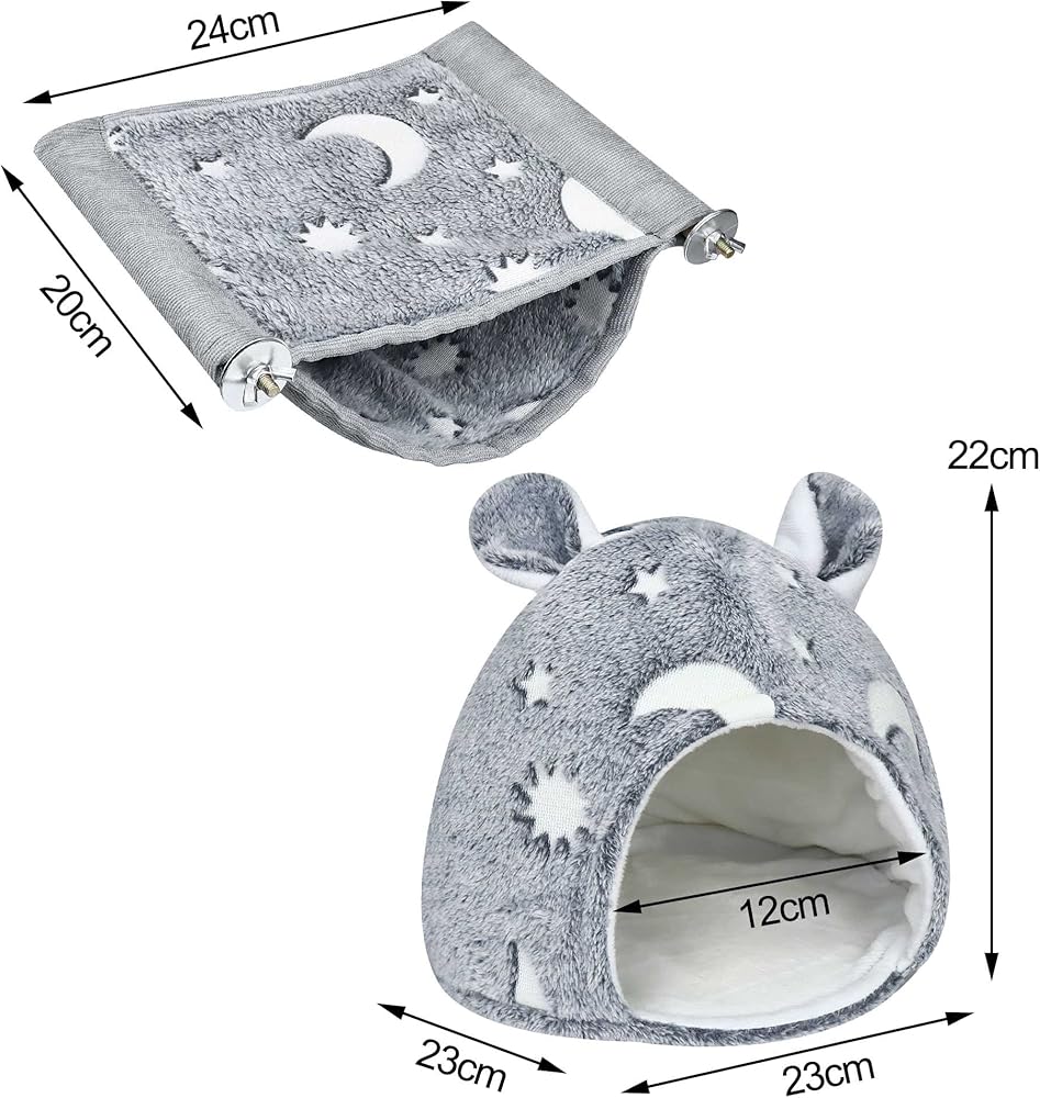【Perfect Hiding Space】-- Our hamster hideaway house measures 9.06 × 9.06 × 8.66in / 23 × 23 × 22cm, the door width is 4.72in / 12cm, and the cage hammock measures 9.45 × 7.87in / 24 × 20cm. the hideaway house nest and double hammock can be hung by durable metal hooks and screws in the cage or anywhere else, expanding to a great extent the small Animal cage activity space for small animals to add more space to play and fun.