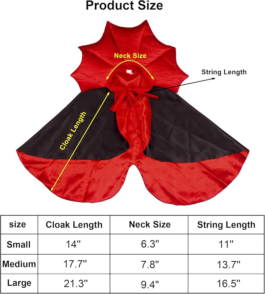 Adjustable Size: Dog vampire cloak's neck girth is 8.5'' (adjustable to tie with string), the longest back length is 17.5'', fit for small, medium large dogs. Please check the size before order.