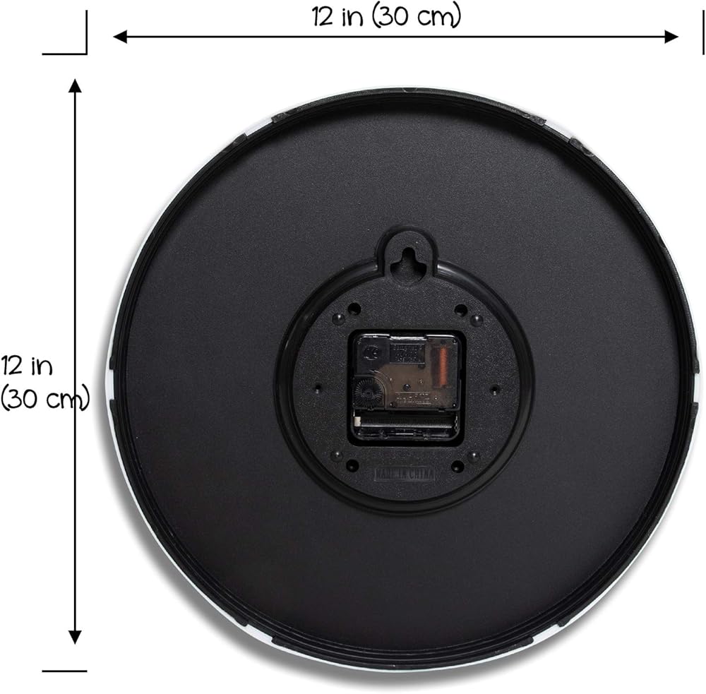- 12 inch wall clock. Easy viewing from every angle thanks to black hands over pink background.