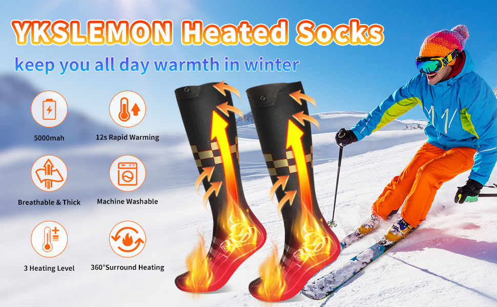 • 【Easy to Use & Care】YKSLEMON Heated Socks are not only easy to use but also easy to care for. These battery-heated socks can be machine washed or hand washed, just remember to remove the battery before washing. The charging cable should be securely stored in the battery pocket to prevent damage.
