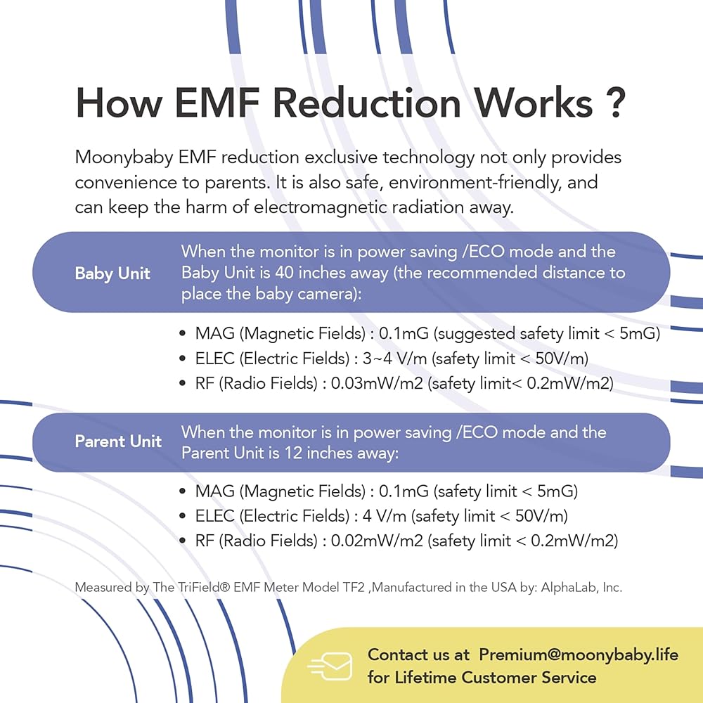 ✅【EMF Reduction Baby Monitor】Moonybaby exclusive Energy Saving Technology can tremendously reduce the magnetic fields, electric fields, and radio fields generated by the baby monitors and keep them under safe value