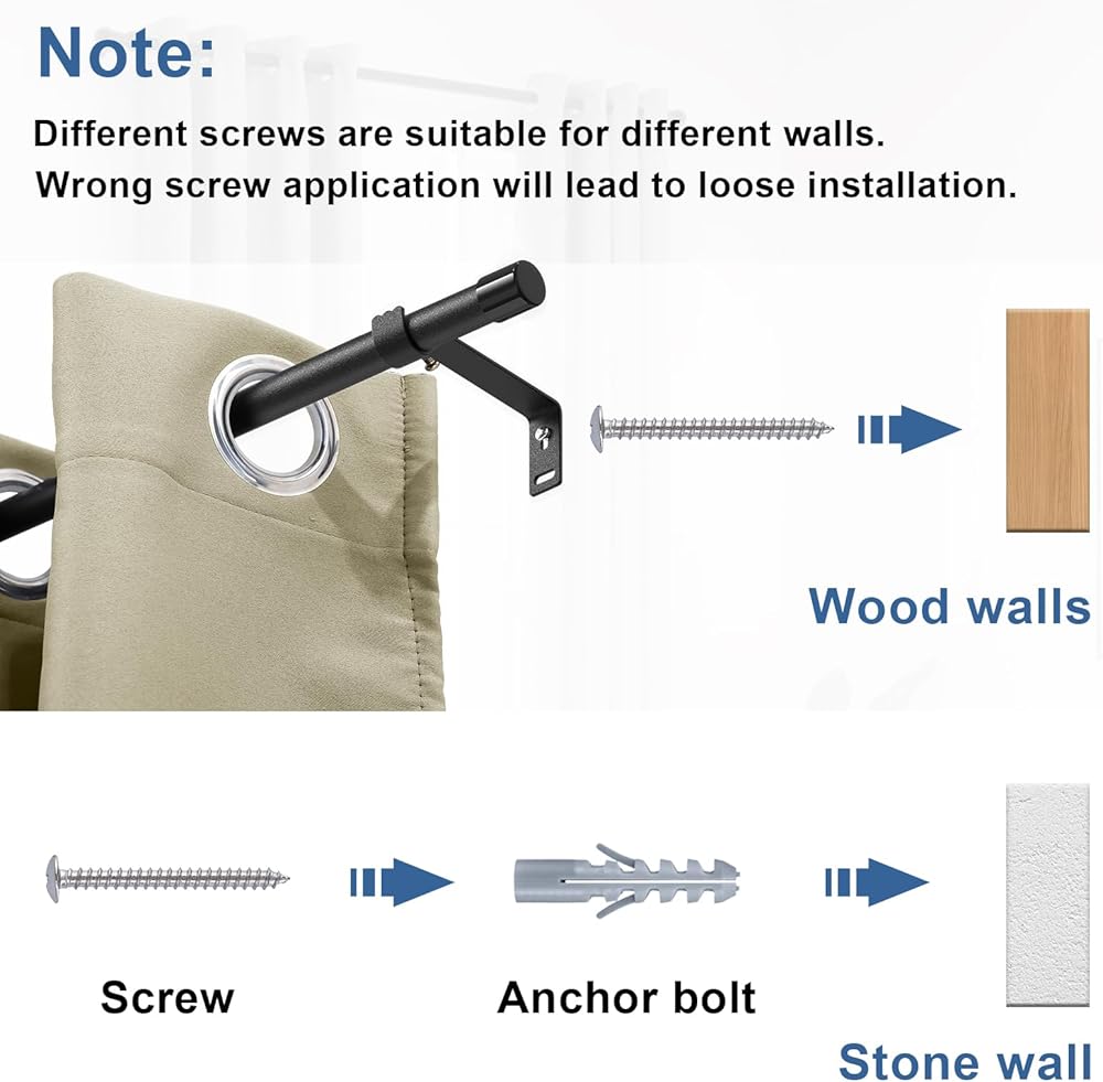 PACKAGE:Matte black curtain rods set comes with all hardware includes brackets,screws,wall anchors and instructions for easy install.