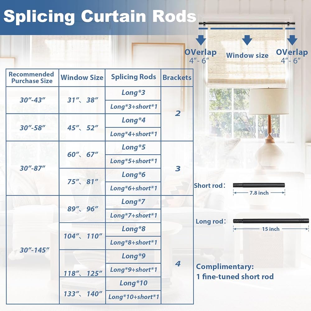 ADJUSTABLE LENGTH: Adjustable curtain rod length can be adjusted by increasing the number of rods. Non-retractable. We offer several sizes of curtain rods from short to long for your choice. Due to the wide range of sizes, you can decorate these curtain rods indoors, such as living room, bedroom, kitchen, study, or install them outdoors, such as deck, patio, pergola ......