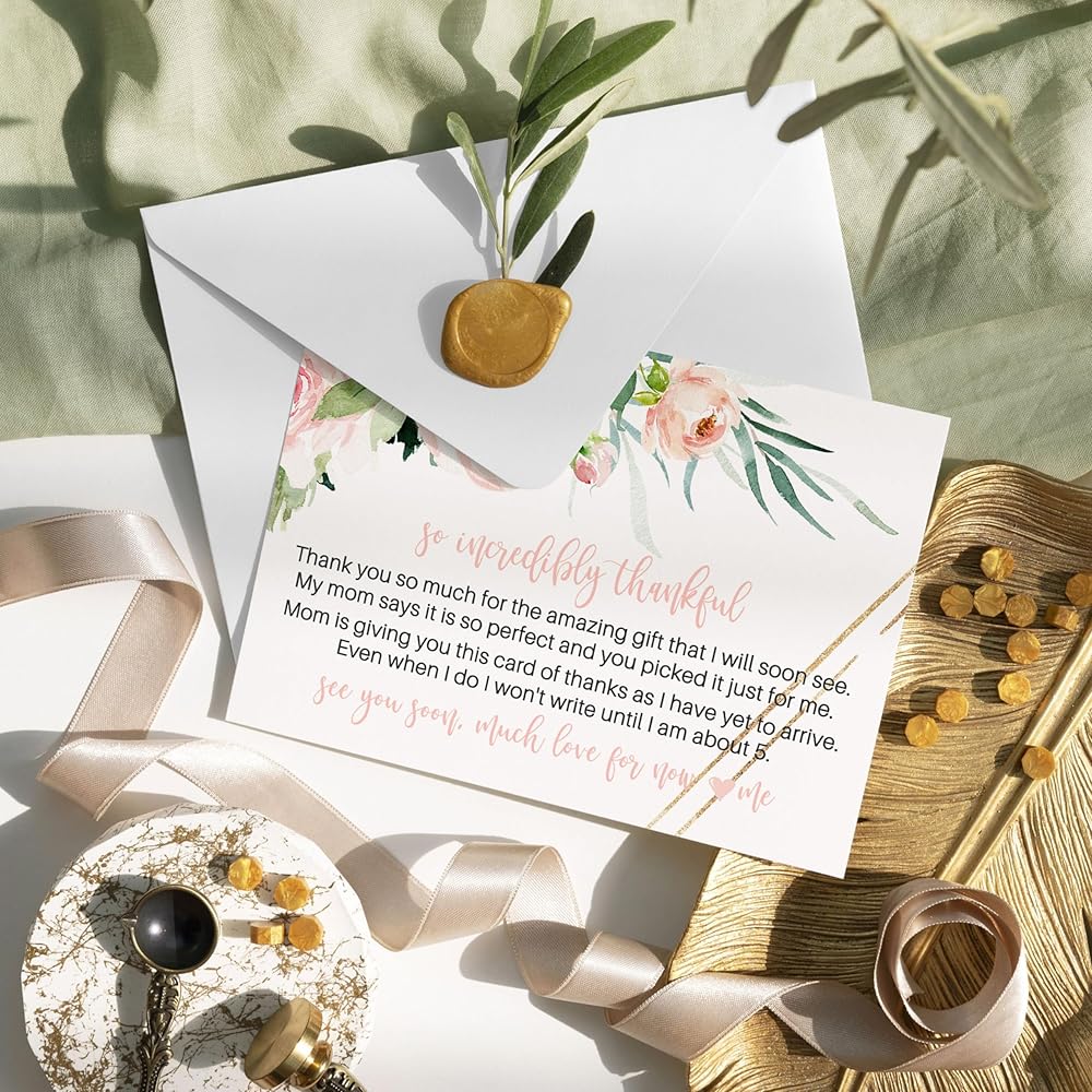Say Thank You! in style with our unique Baby Shower Thank You Cards, adorned in rustic shades of blush and gold. Perfect for extending gratitude towards your guests, this 25-card set offers a charming way to send your thanks. Accompanied by white envelopes, each 4x6 inch card in the set is flat, making them great for handwritten, personalized messages. Baby showers or newborn celebrations aren't complete without these cute cards from Paper Clever Party. Showcasing not just thoughtfulness, but also quality - proudly designed and printed in the USA.