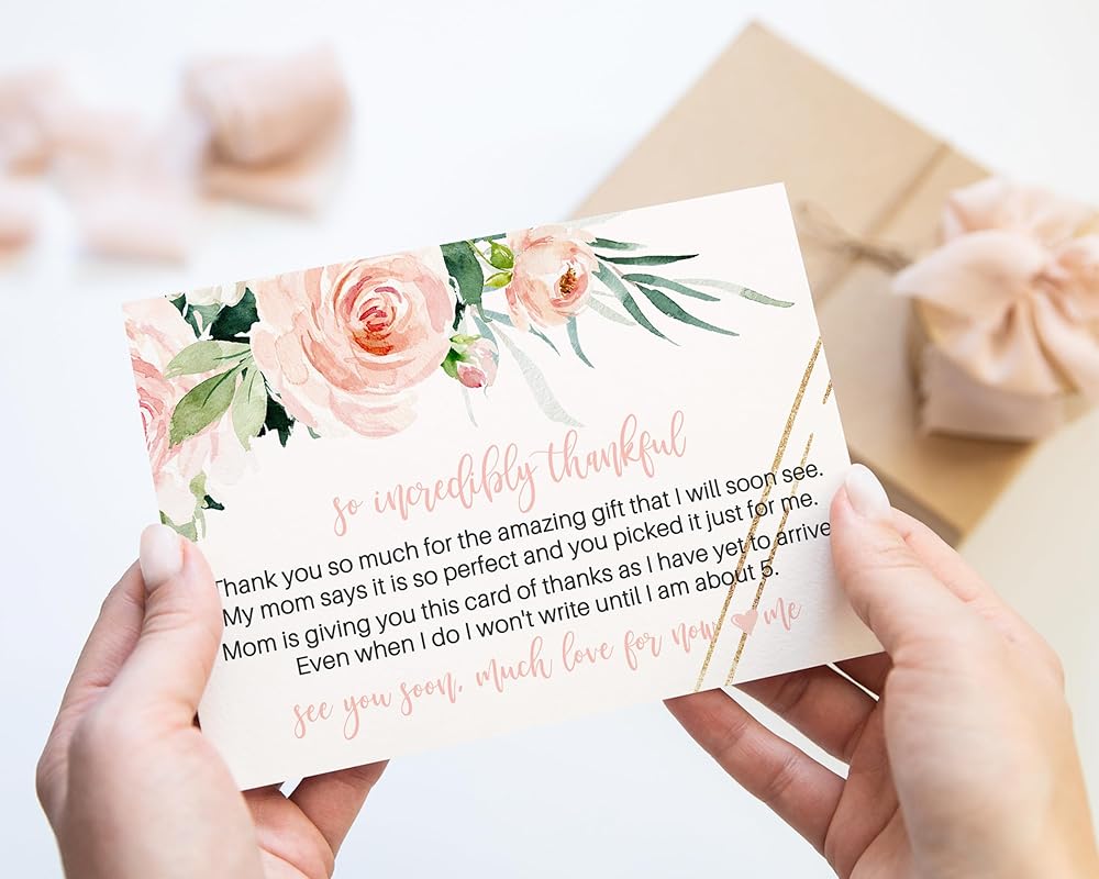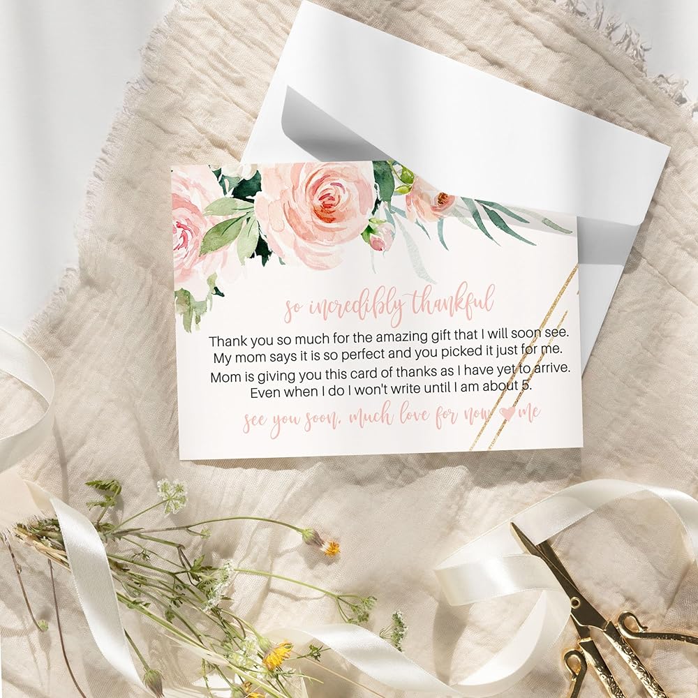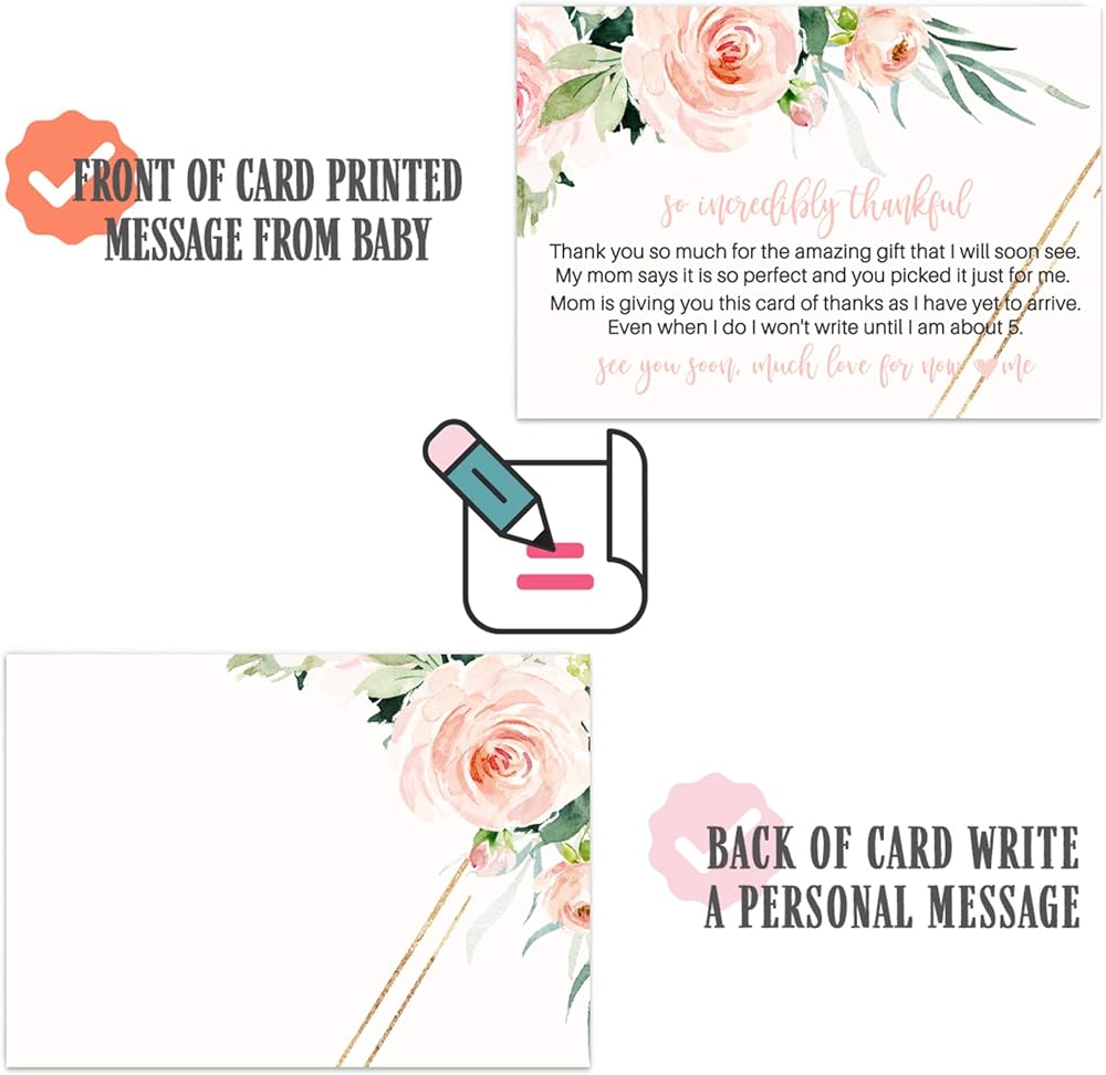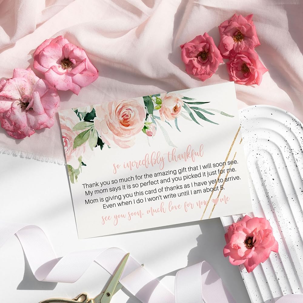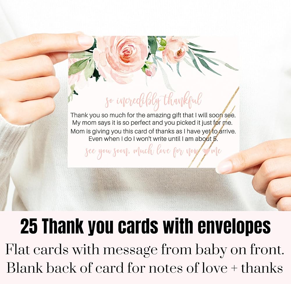 Graceful Floral Baby Shower Thank You Cards with Envelopes (25 Pack) Preprinted Message from Baby Girls with Customizable Space for Handwritten Note from New Parents, 4x6 Double-Sided