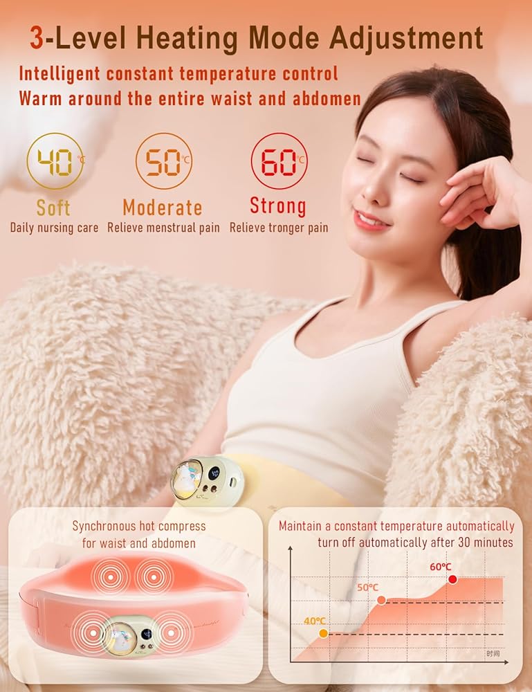 Heating Pad for Period Cramps Portable Cordless w 3 Timer Setting Fast Heated Electric Rechargeble Battery Massager Vibration Modes Adjustable Waist Belt Menstrual Pain Relief Gift for Women Girl
