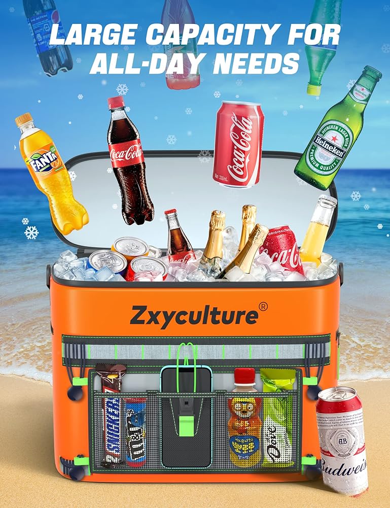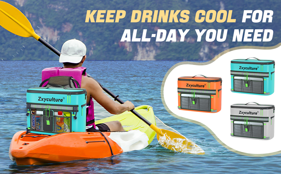 Zxyculture cooler has enough space for 15 bottles or 24 cans of drinks. Size: 17*9*11.8 inches, have more storage space to meet your needs for fishing, hiking, road trips, outdoor camping, beach, kayaking, parties, etc. Must be a great match for kayakers and paddle boarders, make you stay longer on the water again and keep you cool.