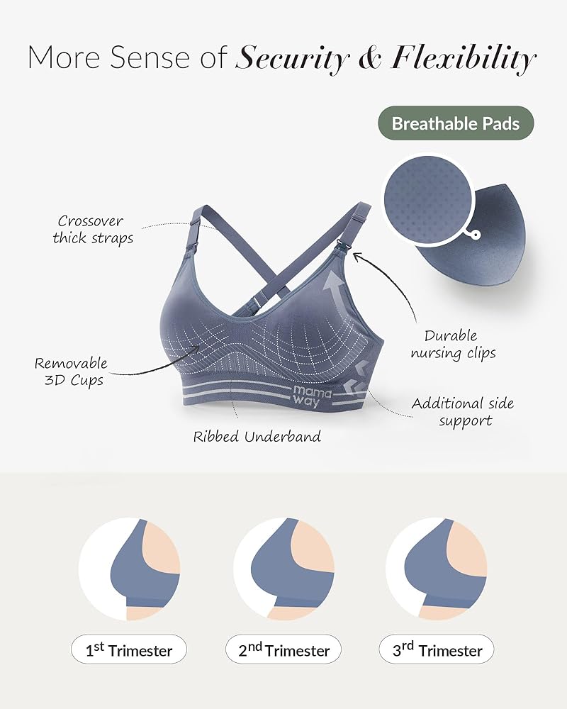 GREAT SUPPORT & UTMOST COMFORT: The bra has high-density knit-in support zones with a cross-back design, providing the ultimate stretchability and stabilization you need. With perfect coverage, the seamless nursing sports bra features 3D molded cups, a wide underband, and high-side panels to structurally support your breast when doing sports. This bra has excellent flexibility that can stretch up to 3 cups for your 9 months of pregnancy and beyond.