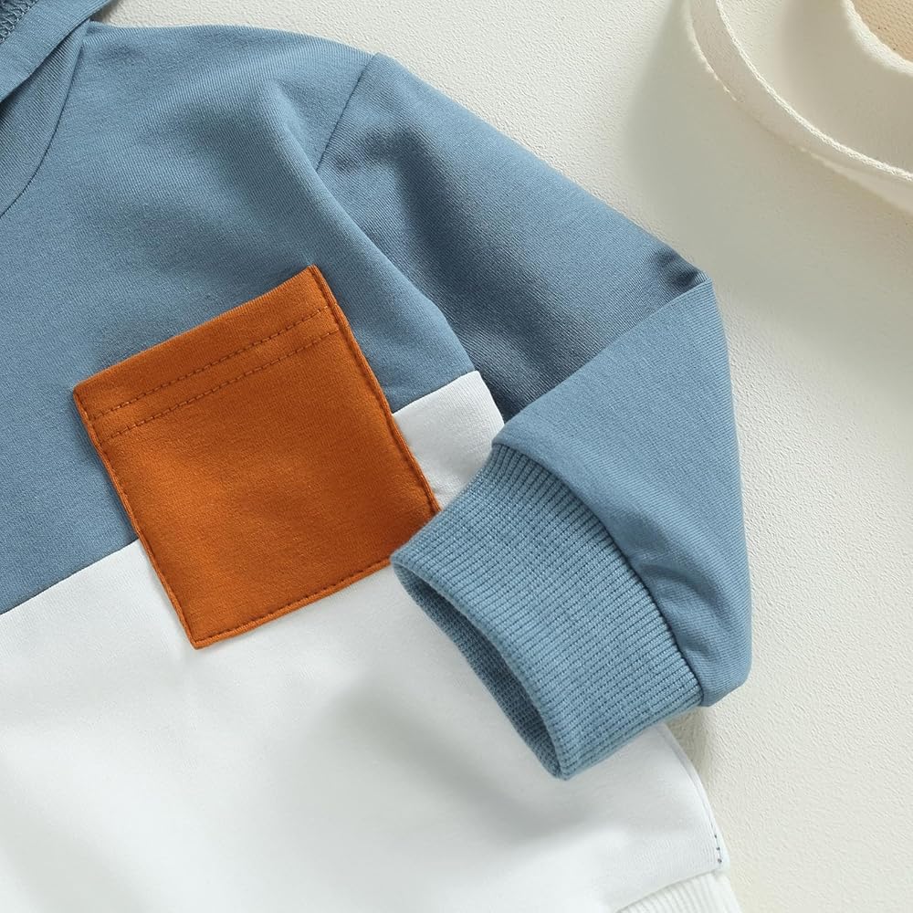 • OCCASIONS: Toddler baby boy fall winter clothes color block hooded sweatshirt set, Perfect for casual wear, daily wear, indoor, outdoor wear, baby photography, birthday gift, party gift, vacation wear, bbq, country, family gathering, or any occasions. Halloween pumpkin patch, Sibling thanksgiving outfits, Christmas gift and so on. cute toddler clothes for boys