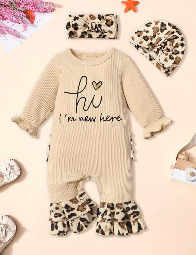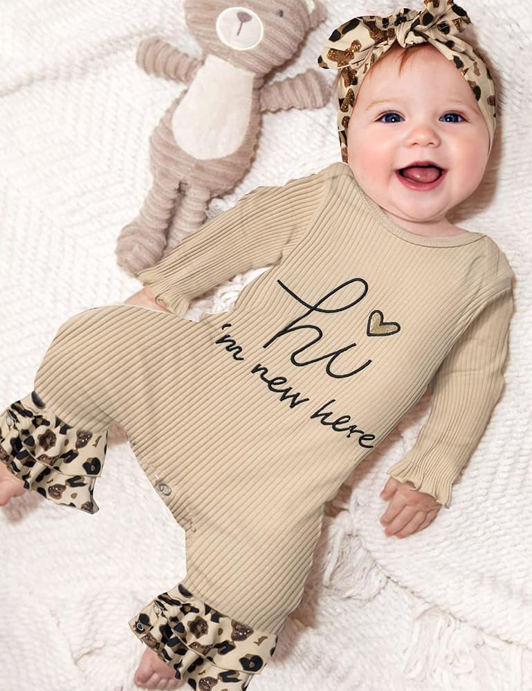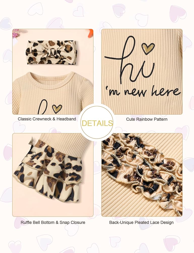 🌷Cute Baby Clothes for Girls: This newborn girl clothes--"hi I'm new here" newborn outfit girl features classic round neck design, a combination of letter print and rainbow patterns, the cuffs of long sleeve baby girl romper are designed with ruffle windproof cuffs, the new design of onesie for baby girl jumpsuit flare bell bottom pants legs keeps your baby fashionable, warm, and cute in autumn and winter.