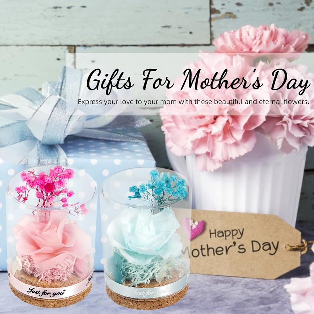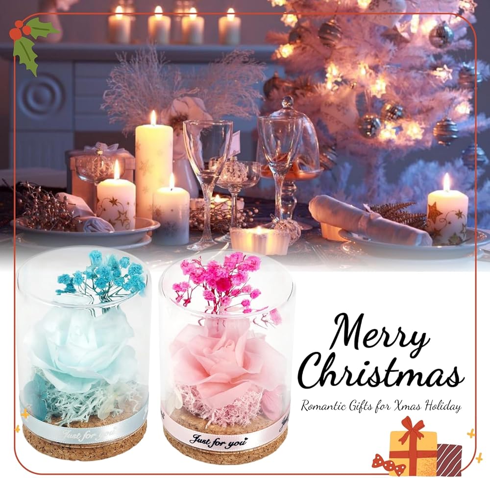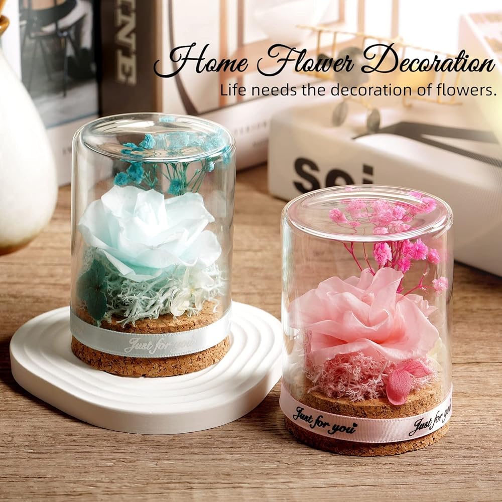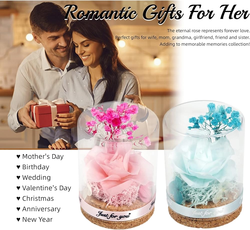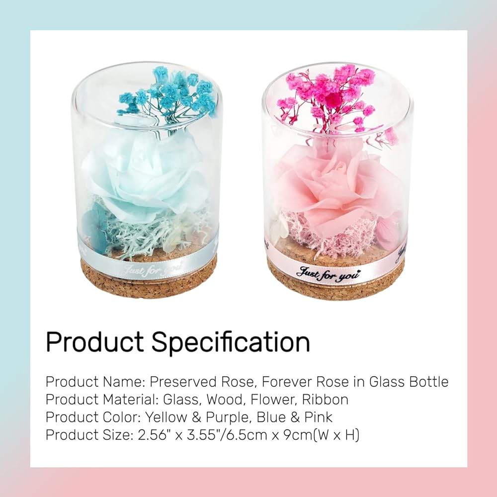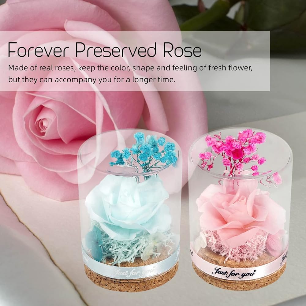 Preserved Eternal Rose in Glass Dome, Gifts for Valentine's Day, Birthday Wedding Anniversary Romantic Forever Flower Gift for Her, 3.55" * 2.56", 2 Pcs/Set, Pink & Blue