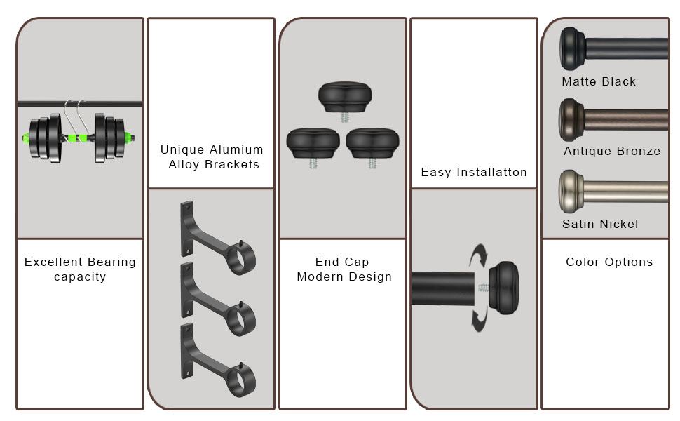 Package Includes-2 Pack curtain rods : Each set included 2 rod,4 End Cap finials, 4 durable mounting Round brackets, and installation instruction