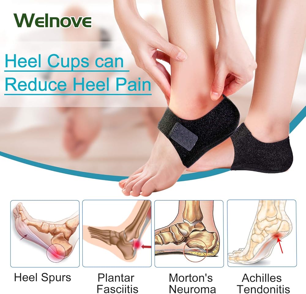 HEEL PAIN RELIEF - Built-in thicker gel, Welnove heel cushion cups can effectively absorb impact, provide support and chushion for your feet, reduce pain or discomfort from plantar fasciitis, achilles tendonitis, injured tendon,heel spur, cracked heel pain, stress fractures and swelling.