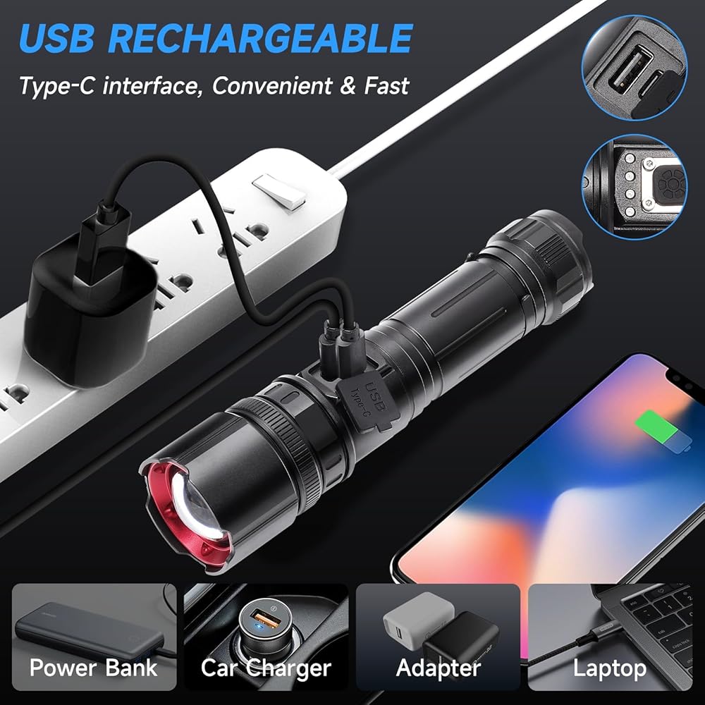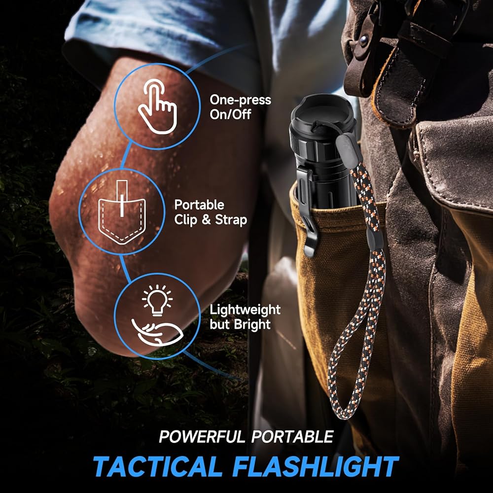 【قوي ومتعدد الاستخدامات】 يوفر المصباح التكتيكي الخاص بنا 5 أوضاع مختلفة - عالي/متوسط/منخفض/فلاش/SOS مما يسمح لك بضبط السطوع والوظيفة وفقًا لاحتياجاتك. تم تصميم المصباح اليدوي بوظيفة التكبير/التصغير. قم بالتكبير والتصغير – كل شيء تحت سيطرتك! يسمح لك وضع الذاكرة الفريد بإغلاقه بمجرد الضغط عليه مع الاستمرار لمدة ثانيتين. وفي المرة التالية التي تفتحه فيها، سيظل في الوضع السابق، مما يلغي الحاجة إلى التنقل خلاله في كل مرة تغلقه فيها.