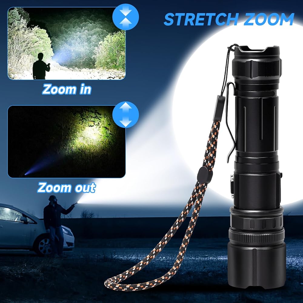 【Powerful & Versatile】 Our tactical flashlight offers 5 different modes - High/Medium/Low/Flash/SOS allowing you to adjust the brightness and functionality according to your needs.Flashlight is designed with a zoom function. Zoom in, zoom out – it's all under your control! The unique memory mode allows you to close it by just pressing and holding it for 2S. The next time you open it, it will still be in the previous mode, eliminating the need to cycle through it every time you close it.