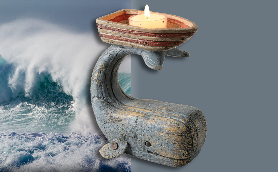 FUN OCEAN DECOR - This adorable blue whale gently supports a little row boat on its tail. Fun tea light candle holder measures about 5 inches wide x 6 inches high x 3 inches deep.