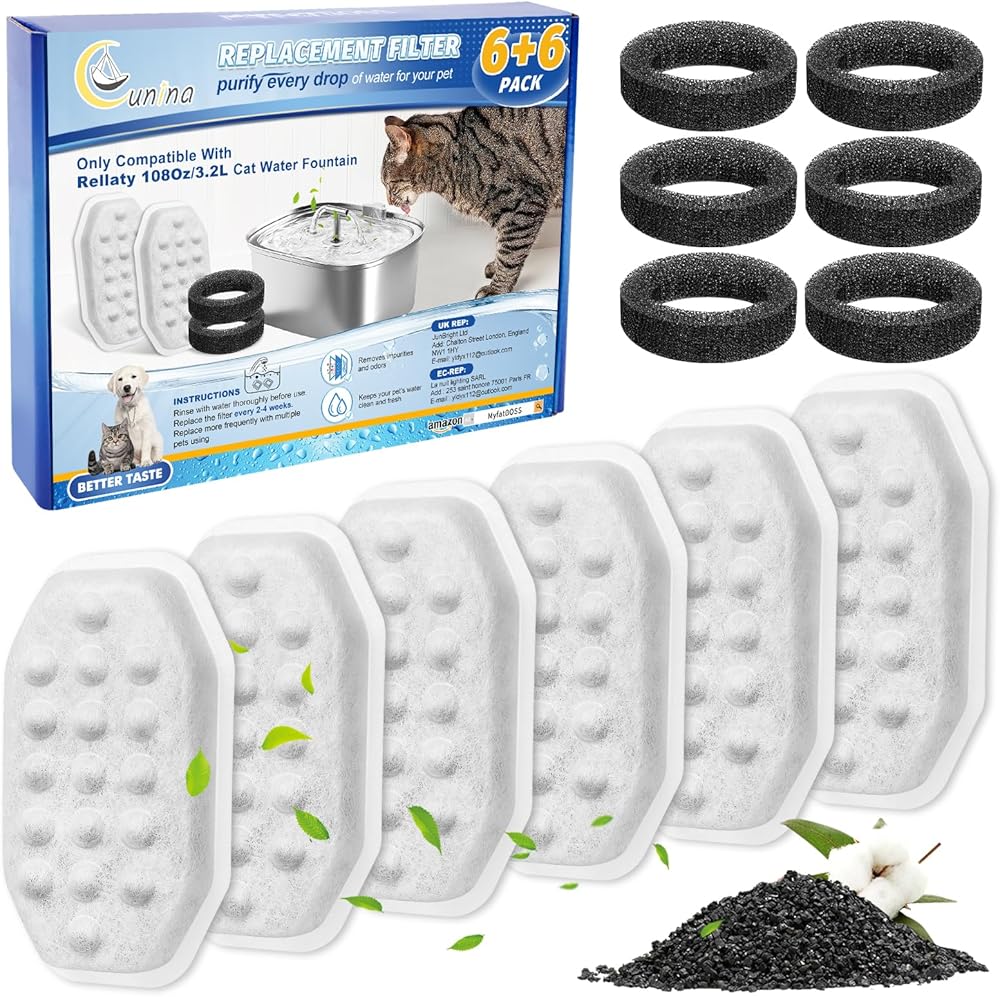 Cunina Cat Water Fountain Filter, Pet Fountain Filter Replacement for Rellaty 3.2L/108oz Pet Water Fountain, 6 Cat Water Fountain Filters & 6 Sponge Filters
